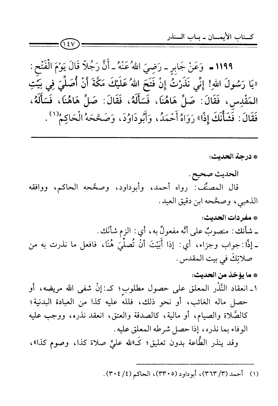 1199 - وَعَنْ جَابِرٍ -رَضِيَ اللهُ عَنْهُ- أَنَّ رَجُلاً قَالَ يَوْمَ الْفَتْحِ: "يَا رَسُولَ اللهِ! إِنِّي نَذَرْتُ إِنْ فَتَحَ اللهُ عَلَيْكَ مَكَّةَ أَنْ أُصَلِّيَ فِي بيْتِ المَقْدِس، فَقَالَ: صَلِّ هَاهُنَا، فَسَأَلَهُ، فَقَالَ: صَلِّ هَاهُنَا، فَسَأَلَهُ، فَقَالَ: فَشَأْنَكَ إِذًا" رَوَاهُ أَحْمَدُ، وَأَبُو دَاوُدَ، وَصَحَّحَهُ الْحَاكِمُ (¬1).