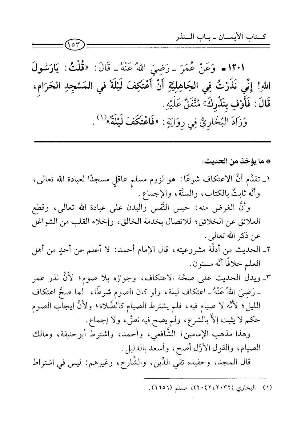 1201 - وَعَنْ عُمَرَ -رَضِىَ اللهُ عَنْهُ- قَالَ: "قُلْتُ: يَا رَسُولَ اللهِ! إِنِّي نَذَرْتُ فِي الجَاهِلِيَّةِ أَنْ اعْتَكِفَ لَيْلَةً في المَسْجِدِ الحَرَامِ، قَالَ: فَأَوْفِ بِنَذْرِكَ" مُتَّفَقٌ عَلَيْهِ.