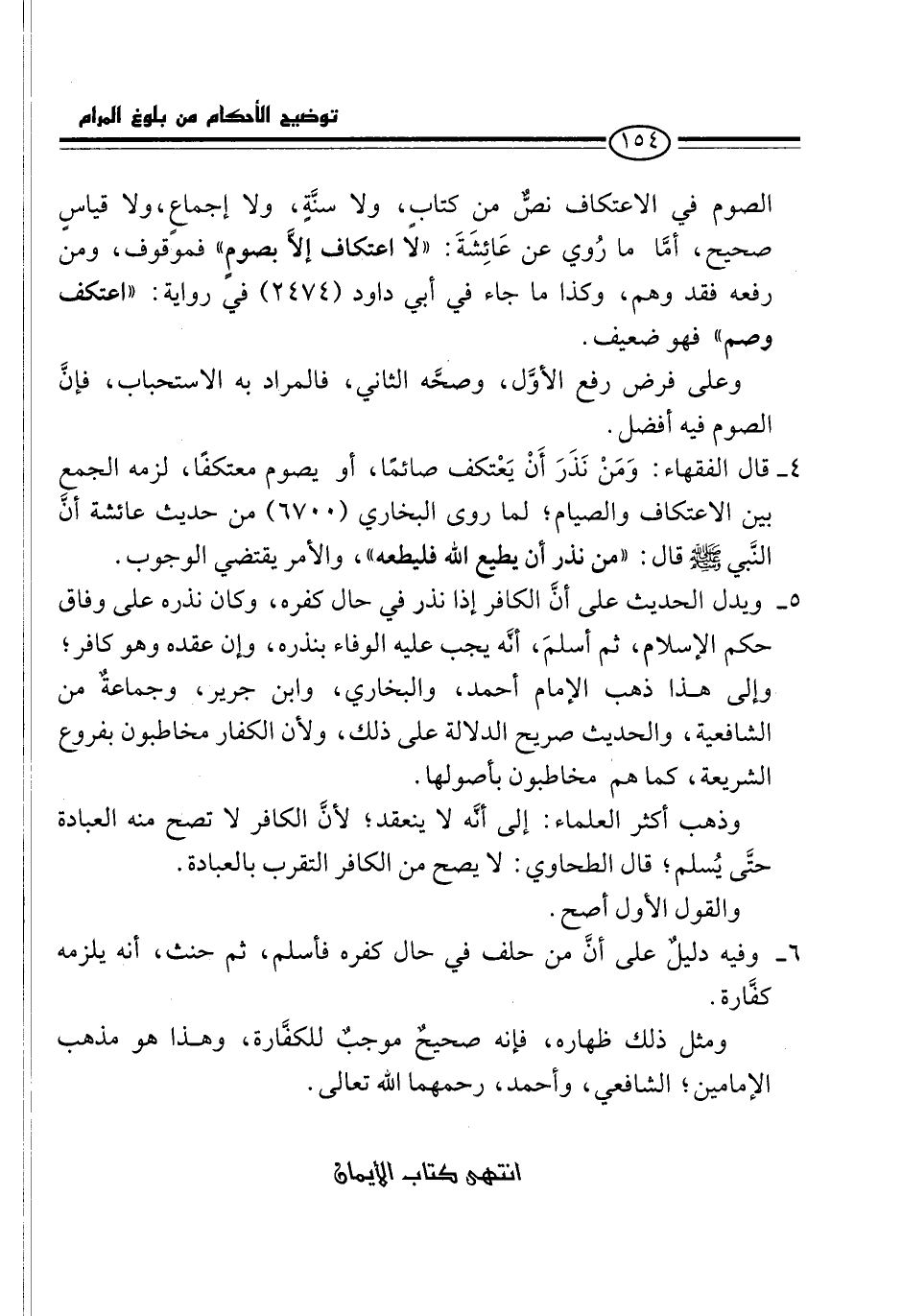 الصوم في الاعتكاف نصٌّ من كتابٍ، ولا سنَّةٍ، ولا إجماعٍ، ولا قياسٍ صحيح، أمَّا ما رُوي عن عَائِشَةَ: "لا اعتكاف إلاَّ بصومٍ" فموقوف، ومن رفعه فقد وهم، وكذا ما جاء في أبي داود (2474) في رواية: "اعتكف وصم" فهو ضعيف.