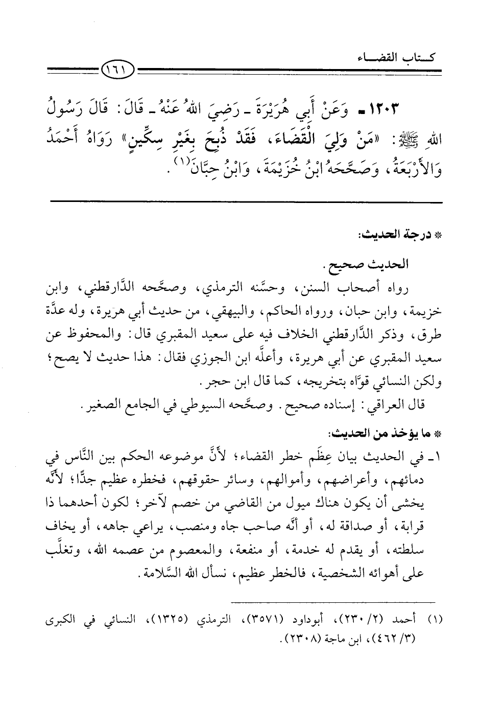 1203 - وَعَنْ أَبِي هُرَيْرَةَ -رَضِيَ اللهُ عَنْهُ- قَالَ: قَالَ رَسُولُ اللهِ -صلى الله عليه وسلم-: "مَنْ وَلِيَ الْقَضَاءَ، فَقَدْ ذُبِحَ بِغَيْرِ سِكِّينٍ" رَوَاهُ أَحْمَدُ وَالأرْبَعَةُ، وَصَحَّحَهُ ابْنُ خُزَيْمَةَ، وَابْنُ حِبَّانَ (¬1).