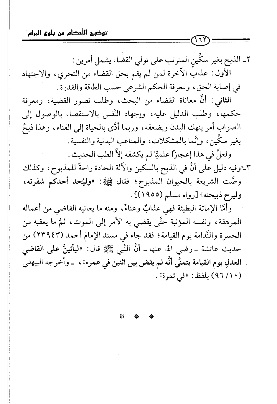 الثاني: أنَّ معاناة القضاء من البحث، وطلب تصور القضية، ومعرفة حكمها، وطلب الدليل عليه، وإجهاد النَّفس بالاستقصاء بالوصول إلى الصواب أمر ينهك البدن ويضعفه، وربما أدَّى بالحياة إلى الفناء، وهذا ذبحٌ بغير سكِّين، وإنَّما بالمشكلات، والمتاعب البدنية والنفسية.