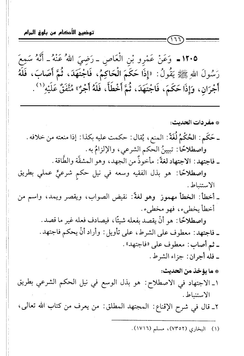 1205 - وَعَنْ عَمْرِو بْنِ الْعَاصِ -رَضِيَ اللهُ عَنْهُ- أَنَّهُ سَمِعَ رَسُولَ اللهِ -صلى الله عليه وسلم- يَقُولُ: "إِذَا حَكَمَ الْحَاكِمُ، فَاجْتَهَدَ، ثُمَّ أَصَابَ، فَلَهُ أَجْرَانِ، وَإِذَا حَكَمَ، فَاجْتَهَدَ، ثُمَّ أَخْطَأَ، فَلَهُ أَجْرٌ" مُتَّفَقٌ عَلَيْهِ (¬1).