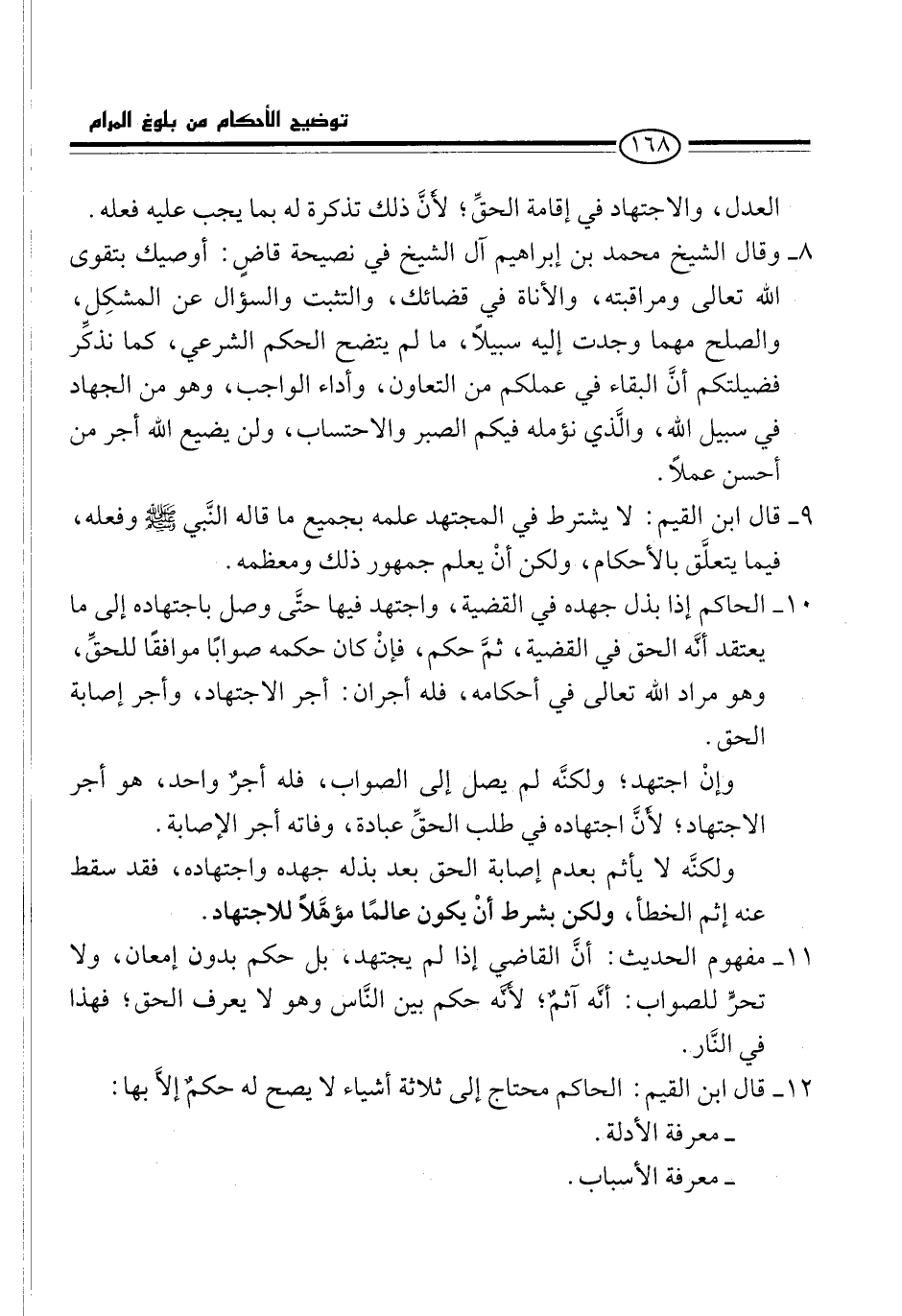 9 - قال ابن القيم: لا يشترط في المجتهد علمه بجميع ما قاله النَّبي -صلى الله عليه وسلم- وفعله، فيما يتعلَّق بالأحكام، ولكن أنْ يعلم جمهور ذلك ومعظمه.