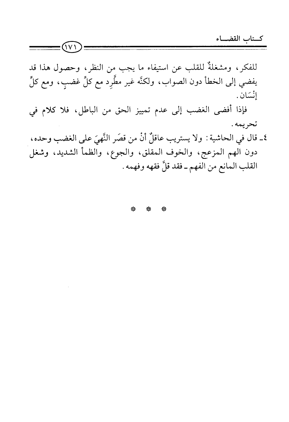 4 - قال في الحاشية: ولا يستريب عاقلٌ أنْ من قصَر النَّهيَ على الغضب وحده، دون الهم المزعج، والخوف المقلق، والجوع، والظمأ الشديد، وشغل القلب المانع من الفهم -فقد قلَّ فقهه وفهمه.