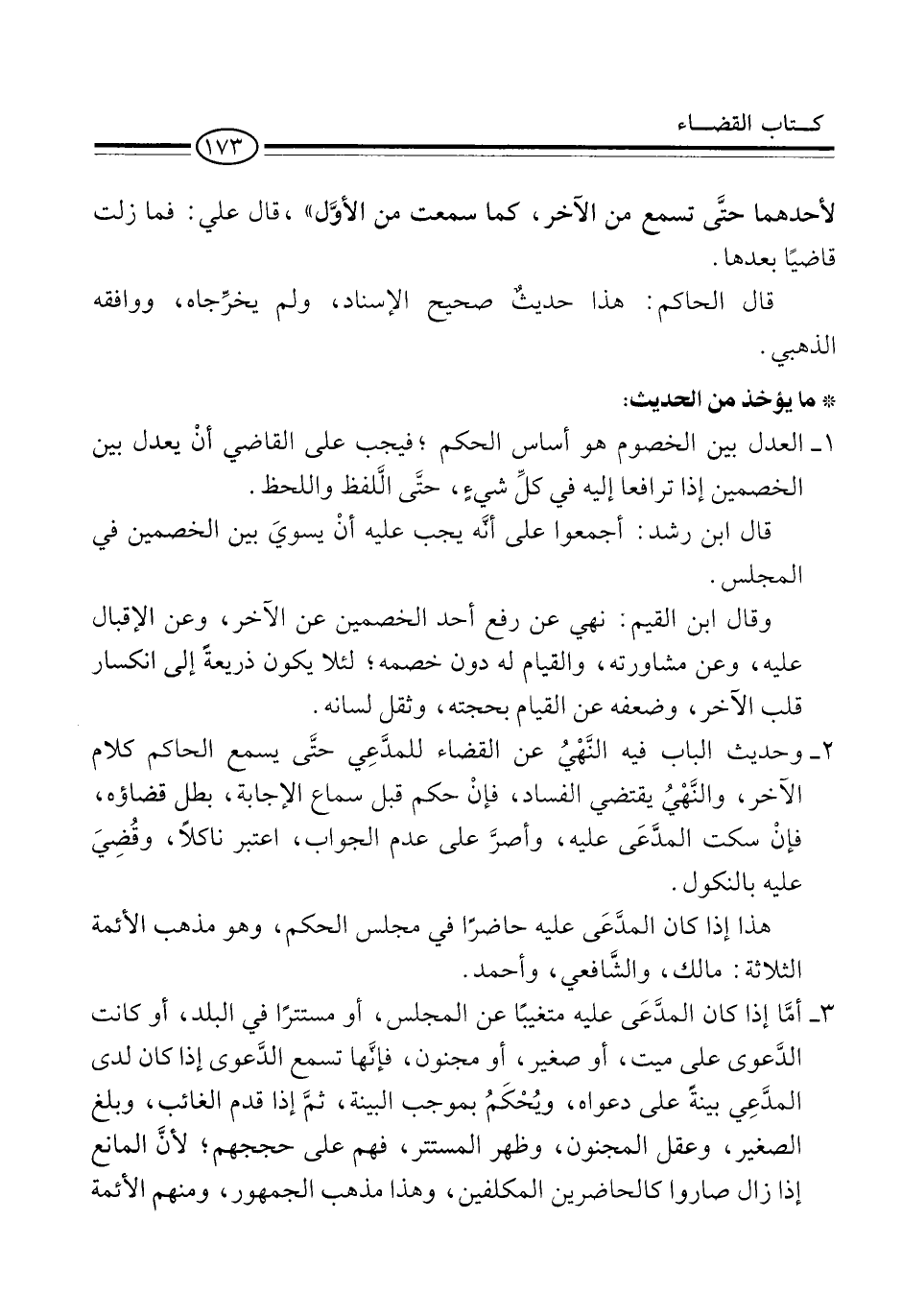 1 - العدل بين الخصوم هو أساس الحكم؛ فيجب على القاضي أنْ يعدل بين الخصمين إذا ترافعا إليه في كلِّ شيءٍ، حتَّى الَّلفظ واللحظ.