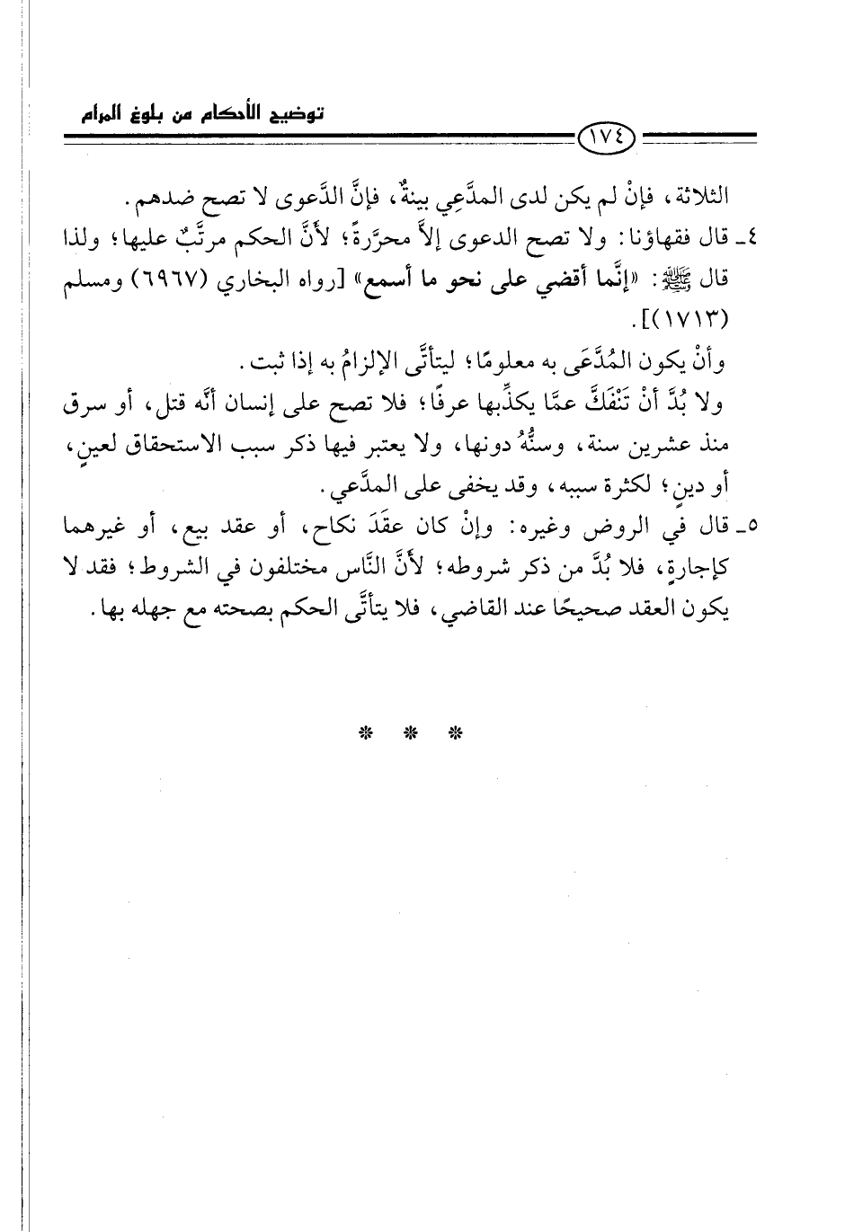 4 - قال فقهاؤنا: ولا تصح الدعوى إلاَّ محرَّرةً؛ لأنَّ الحكم مرتَّبٌ عليها؛ ولذا قال -صلى الله عليه وسلم-: "إنَّما أقضي على نحو ما أسمع" [رواه البخاري (6967) ومسلم (1713)].