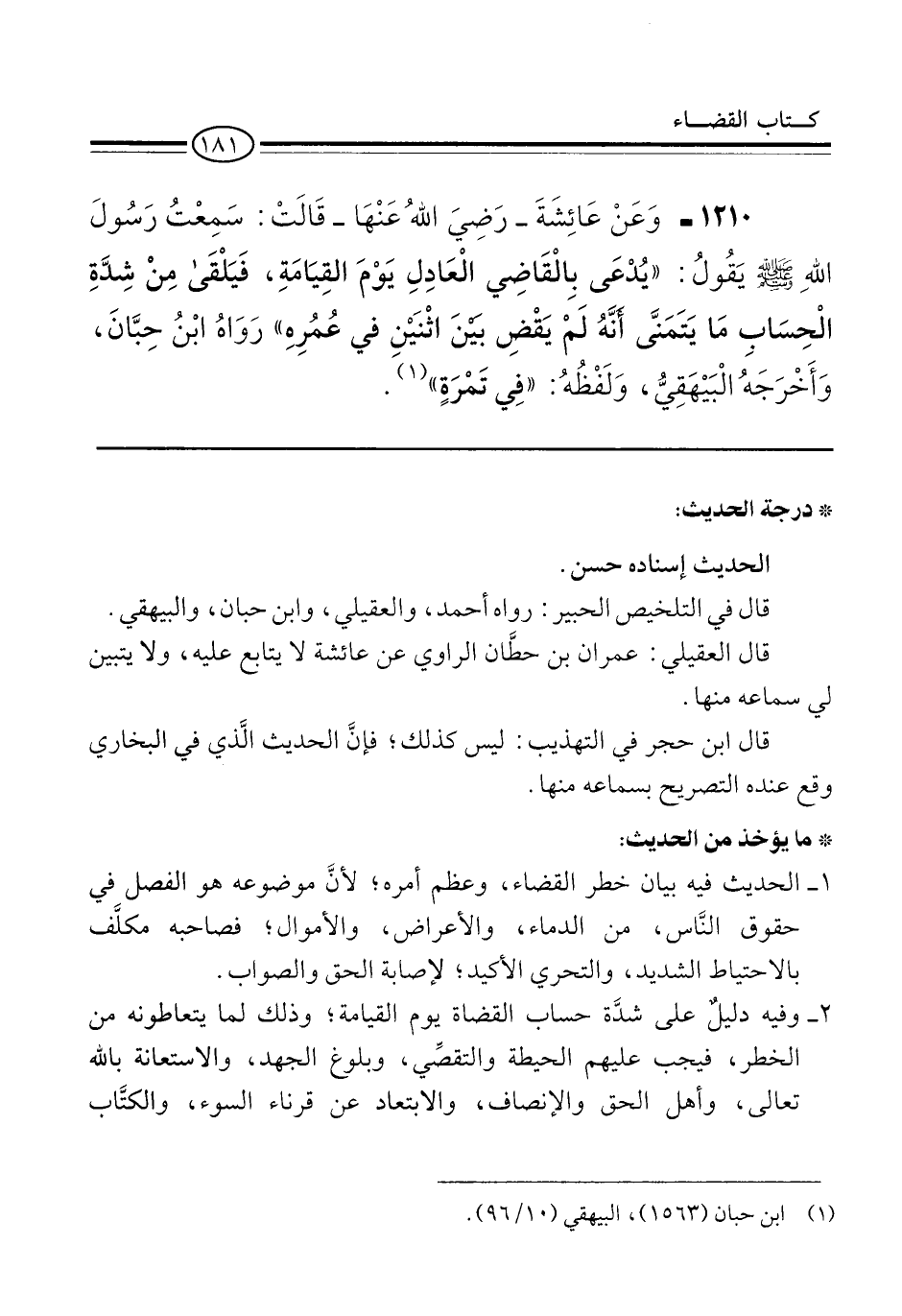 1210 - وَعَنْ عَائِشَةَ -رَضِيَ اللهُ عَنْهَا- قَالَتْ: سَمِعْتُ رَسُولَ اللهِ -صلى الله عليه وسلم- يقُولُ: "يُدْعَى بِالْقَاضِي الْعَادِلِ يَوْمَ القِيَامَةِ، فَيَلْقَى مِنْ شِدَّةِ الْحِسَابِ مَا يَتَمَنَّى أَنَّهُ لَمْ يَقْضِ بَيْنَ اثْنَيْنِ في عُمُرِهِ" رَوَاهُ ابْنُ حِبَّانَ، وَأَخْرَجَهُ الْبَيْهَقِيُّ، وَلَفْظُهُ: "فِي تَمْرَةٍ" (¬1).
