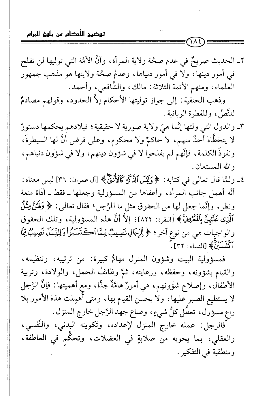 4 - ولمَّا قال تعالى في كتابه: {وَلَيْسَ الذَّكَرُ كَالْأُنْثَى} [آل عمران: 36] ليس معناه: أنَّه أهمل جانب المرأة، وأعفاها من المسؤولية وجعلها -فقط- أداة متعة ونظر، وإنَّما جعل لها من الحقوق مثل ما للرَّجل؛ فقال تعالى: {وَلَهُنَّ مِثْلُ الَّذِي عَلَيْهِنَّ بِالْمَعْرُوفِ} [البقرة: 228]؛ إلاَّ أنَّ هذه المسؤولية، وتلك الحقوق والواجبات هي من نوعٍ آخر؛ {لِلرِّجَالِ نَصِيبٌ مِمَّا اكْتَسَبُوا وَلِلنِّسَاءِ نَصِيبٌ مِمَّا اكْتَسَبْنَ} [النساء: 32].