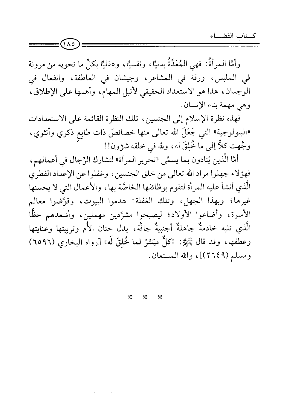 أمَّا الَّذين يُنادون بما يسمَّى "تحرير المرأة" لتشارك الرِّجال في أعمالهم، فهؤلاء جهلوا مراد الله تعالى من خلق الجنسين، وغفلوا عن الإعداد الفطري الَّذي أنشأ عليه المرأة لتقوم بوظائفها الخاصَّة بها، والأعمال التي لا يحسنها غيرها؛ وبهذا الجهل، وتلك الغفلة: هدموا البيوت، وقوَّضوا معالم الأسرة، وأضاعوا الأولاد؛ ليصبحوا مشرَّدين مهملين، وأسعدهم حظًّا الَّذي تليه خادمةٌ جاهلةٌ أجنبيةٌ جافَّة، بدل حنان الأُم وتربيتها وعنايتها وعطفها، وقد قال -صلى الله عليه وسلم-: "كلٌّ ميَسَّرٌ لما خُلِقَ لَه" [رواه البخاري (6596) ومسلم (2649)]، والله المستعان.