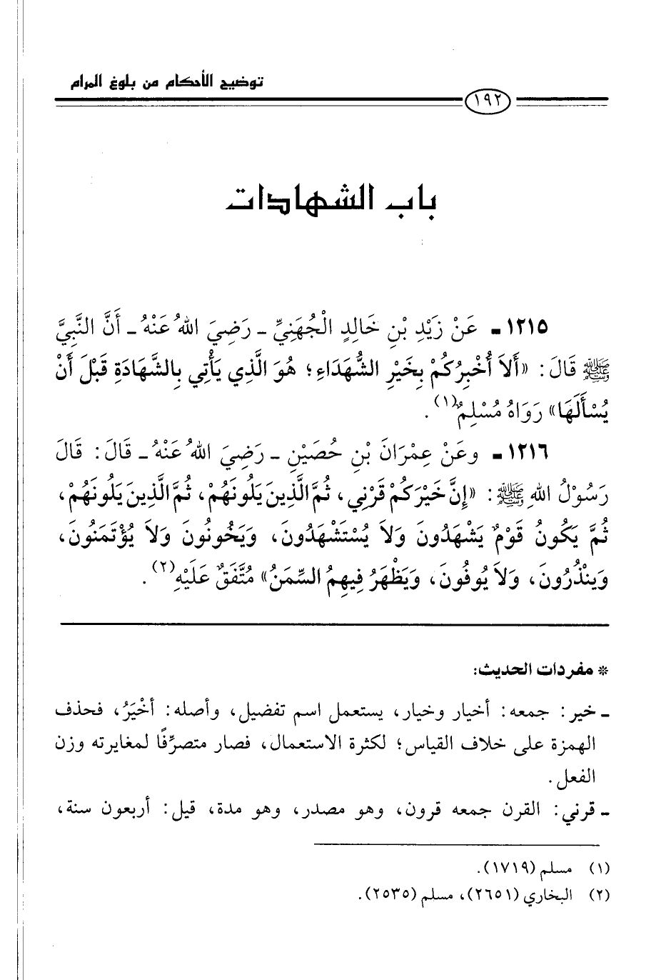 1215 - عَنْ زَيْدِ بْنِ خَالِدٍ الْجُهَنِيِّ -رَضِيَ اللهُ عَنْهُ- أَنَّ النَّبيَّ -صلى الله عليه وسلم- قَالَ: "أَلاَ أُخْبِرُكُمْ بخَيْرِ الشُّهَدَاءِ؛ هُوَ الَّذِي يَأْتِي بِالشَّهَادَةِ قَبْلَ أَنْ يُسْأَلَهَا" رَوَاهُ مُسْلِمٌ (¬1).