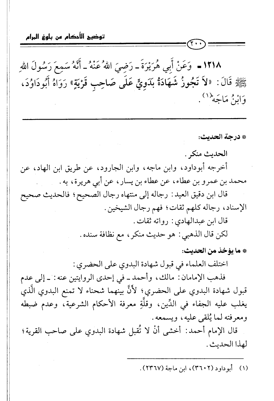 1218 - وَعَنْ أَبِي هُرَيْرَةَ -رَضِيَ اللهُ عَنْهُ- أَنَّهُ سَمِعَ رَسُولَ اللهِ -صلى الله عليه وسلم- قَالَ: "لاَ تَجُوزُ شَهَادَة بَدَوِيٍّ عَلَى صَاحِب قَرْيَةٍ" رَوَاهُ أَبُو دَاوُدَ، وَابْنُ مَاجَهْ (¬1).