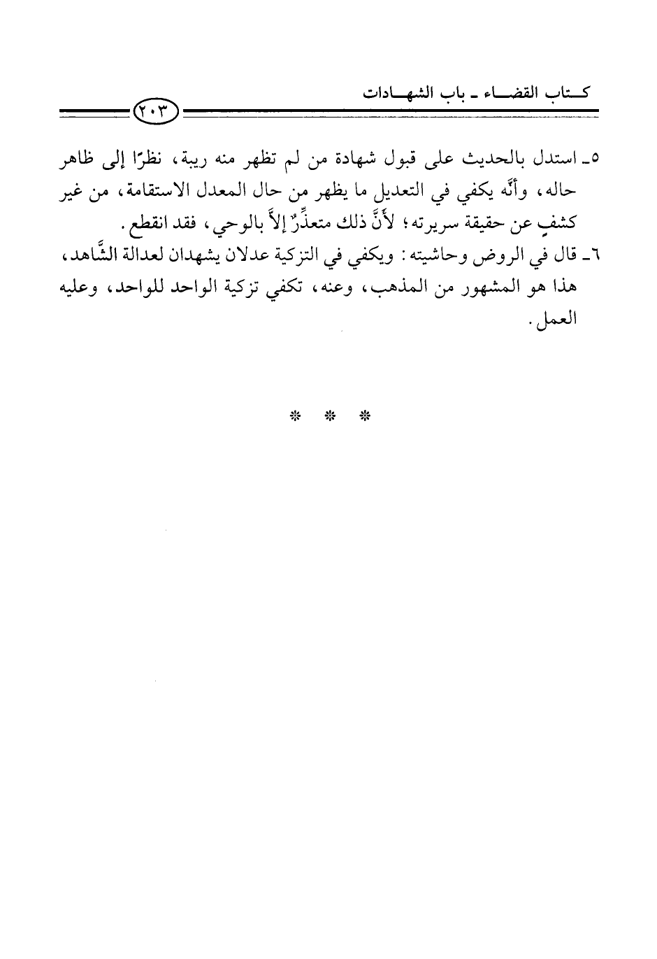 6 - قال في الروض وحاشيته: ويكفي في التزكية عدلان يشهدان لعدالة الشَّاهد، هذا هو المشهور من المذهب، وعنه، تكفي تزكية الواحد للواحد، وعليه العمل.