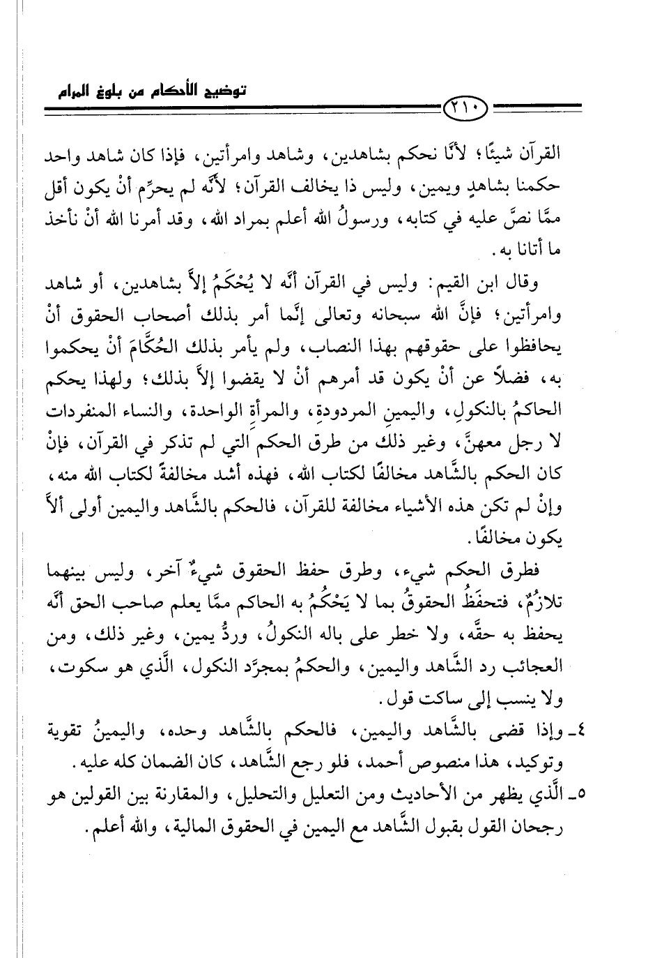وقال ابن القيم: وليس في القرآن أنَّه لا يُحْكَمُ إلاَّ بشاهدين، أو شاهد وامرأتين؛ فإنَّ الله سبحانه وتعالى إنَّما أمر بذلك أصحاب الحقوق أنْ يحافظوا على حقوقهم بهذا النصاب، ولم يأمر بذلك الحُكَّامَ أنْ يحكموا به، فضلاً عن أنْ يكون قد أمرهم أنْ لا يقضوا إلاَّ بذلك؛ ولهذا يحكم الحاكمُ بالنكولِ، واليمينِ المردودةِ، والمرأة الواحدة، والنساء المنفردات لا رجل معهنَّ، وغير ذلك من طرق الحكم التي لم تذكر في القرآن، فإنْ كان الحكم بالشَّاهد مخالفاً لكتاب الله، فهذه أشد مخالفةً لكتاب الله منه، وإنْ لم تكن هذه الأشياء مخالفة للقرآن، فالحكم بالشَّاهد واليمين أولى ألاَّ يكون مخالفاً.