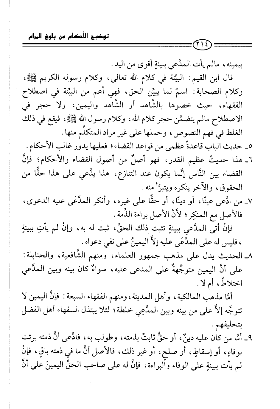 6 - هذا حديثٌ عظيم القدر، فهو أصلٌ من أصول القضاء والأحكام؛ فإنَّ القضاء بين النَّاس إنَّما يكون عند التنازع، هذا يدَّعي على هذا حقًّا من الحقوق، والآخر ينكره ويتبرَّأ منه.