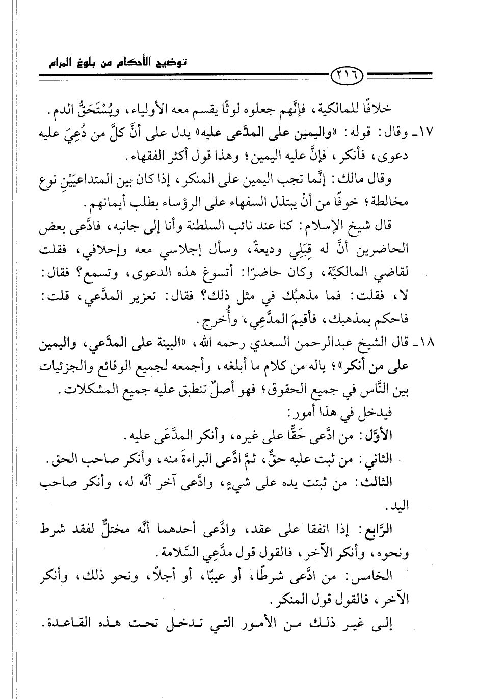 18 - قال الشيخ عبد الرحمن السعدي رحمه الله، "البينة على المدَّعي، واليمين على من أنكر"؛ ياله من كلام ما أبلغه، وأجمعه لجميع الوقائع والجزئيات بين النَّاس في جميع الحقوق؛ فهو أصلٌ تنطبق عليه جميع المشكلات.