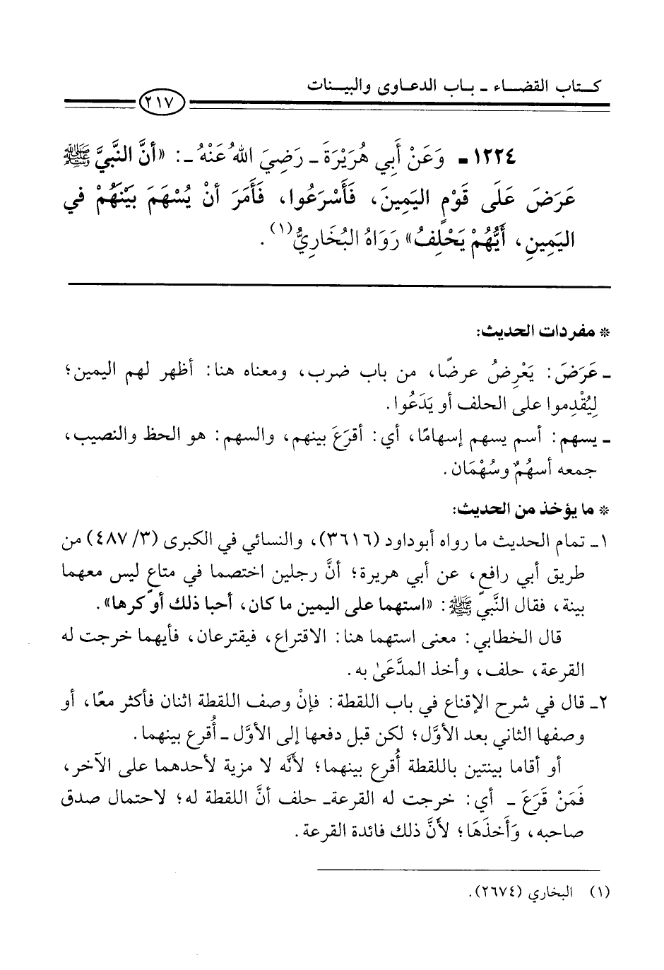 1224 - وَعَنْ أَبِي هُرَيْرَةَ -رَضِيَ اللهُ عَنْهُ-: "أنَّ النَّبيَّ -صلى الله عليه وسلم- عَرَضَ عَلَى قَوْمٍ اليَمِينَ، فَأَسْرَعُوا، فَأَمَرَ أنْ يُسْهَمَ بَيْنَهُمْ في اليَمِينِ، أَيُّهُمْ يَحْلِفُ" رَوَاهُ البُخَارِيُّ (¬1).