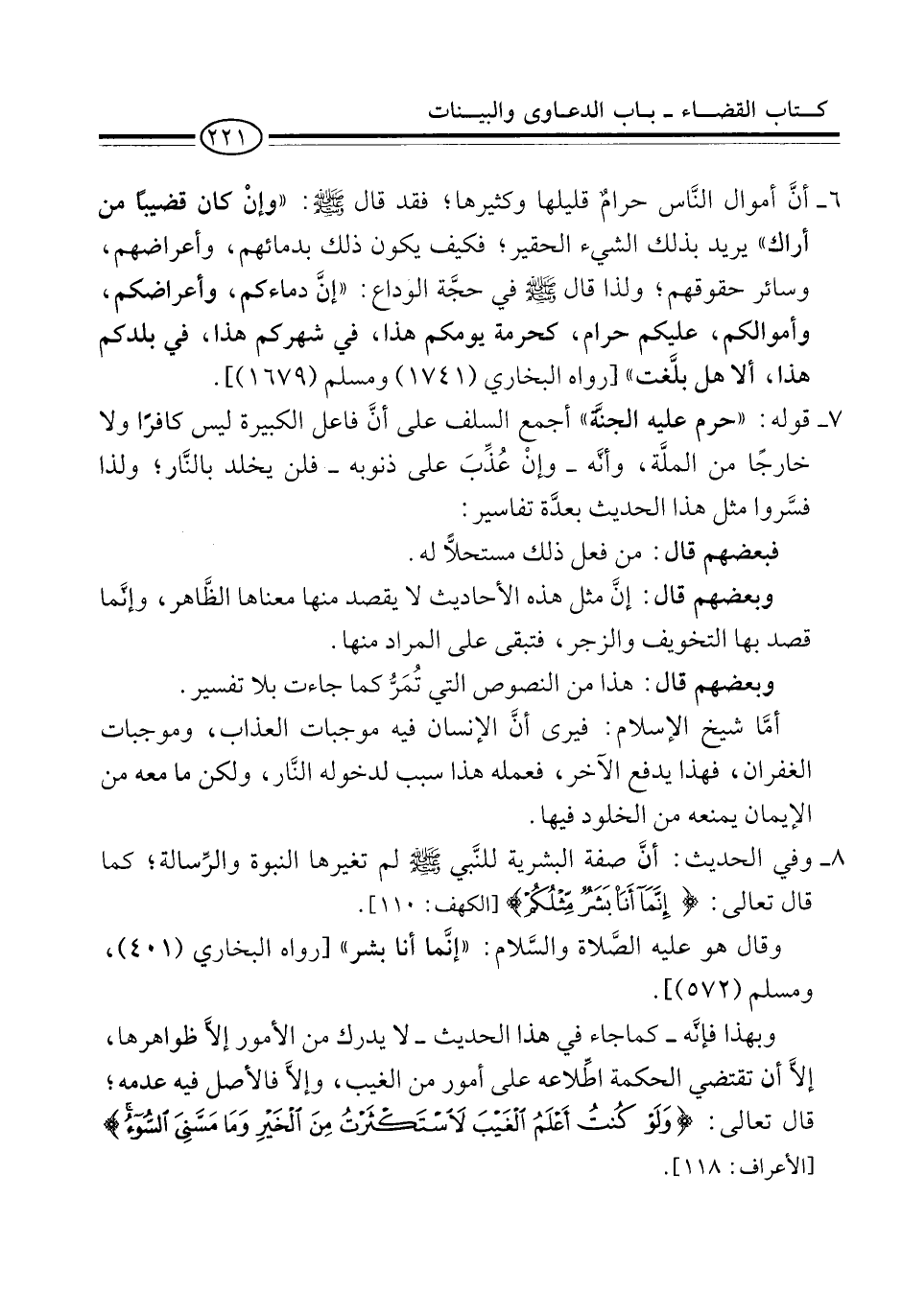 6 - أنَّ أموال النَّاس حرامٌ قليلها وكثيرها؛ فقد قال -صلى الله عليه وسلم-: "وإنْ كان قضيباً من أراك" يريد بذلك الشيء الحقير؛ فكيف يكون ذلك بدمائهم، وأعراضهم، وسائر حقوقهم؛ ولذا قال -صلى الله عليه وسلم- في حجَّة الوداع: "إنَّ دماءكم، وأعراضكم، وأموالكم، عليكم حرام، كحرمة يومكم هذا، في شهركم هذا، في بلدكم هذا، ألا هل بلَّغت" [رواه البخاري (1741) ومسلم (1679)].