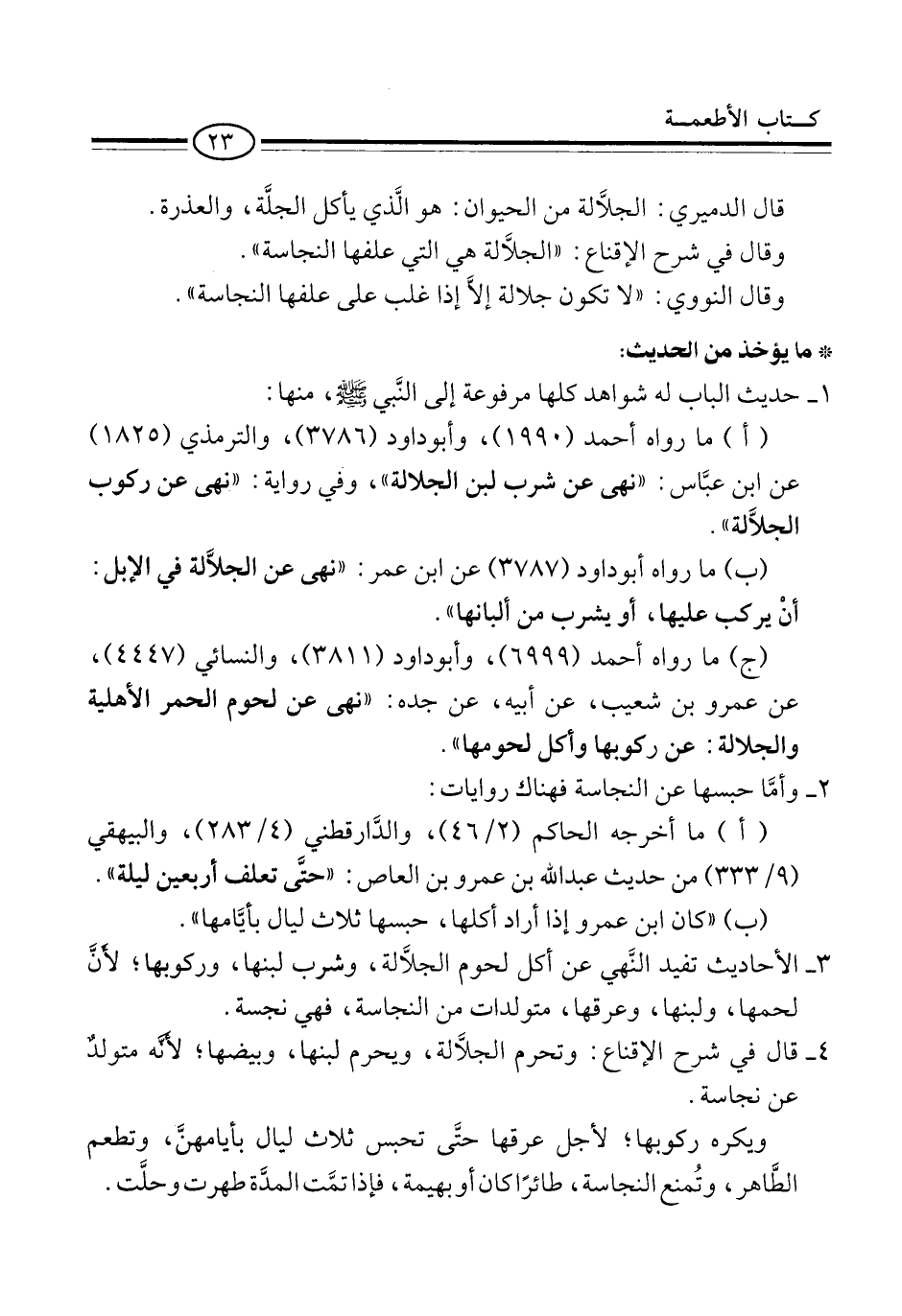 (أ) ما رواه أحمد (1990)، وأبو داود (3786)، والترمذي (1825) عن ابن عبَّاس: "نهى عن شرب لبن الجلالة"، وفي رواية: "نهى عن ركوب الجلاَّلة".