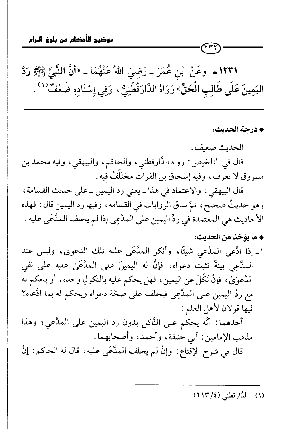 1231 - وعَنْ ابْنِ عُمَرَ -رَضِيَ اللهُ عَنْهُمَا- "أنَّ النَّبيَّ -صلى الله عليه وسلم- رَدَّ اليَمِينَ عَلَى طَالِبِ الْحَقِّ" رَوَاهُ الدَّارَقُطْنِيُّ، وَفِي إِسْنَادِهِ ضَعْفٌ (¬1).