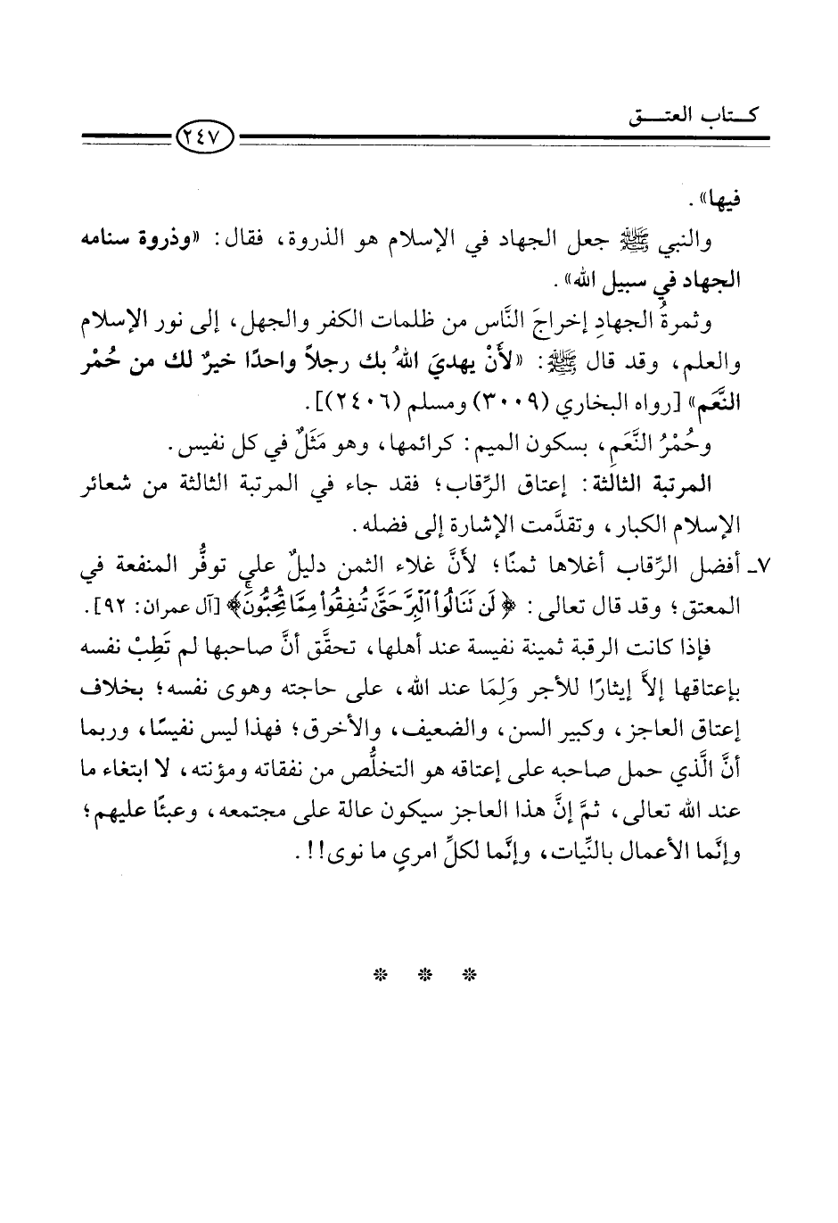 فإذا كانت الرقبة ثمينة نفيسة عند أهلها، تحقَّق أنَّ صاحبها لم تَطِبْ نفسه بإعتاقها إلاَّ إيثاراً للأجر وَلِمَا عند الله، على حاجته وهوى نفسه؛ بخلاف إعتاق العاجز، وكبير السن، والضعيف، والأخرق؛ فهذا ليس نفيساً، وربما أنَّ الَّذي حمل صاحبه على إعتاقه هو التخلُّص من نفقاته ومؤنته، لا ابتغاء ما عند الله تعالى، ثمَّ إنَّ هذا العاجز سيكون عالة على مجتمعه، وعبئاً عليهم؛ وإنَّما الأعمال بالنِّيات، وإنَّما لكلِّ امرىٍ ما نوى!!.