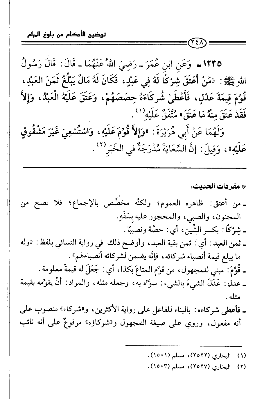 1235 - وَعَنِ ابْنِ عُمَرَ -رَضِيَ اللهُ عَنْهُمَا- قَالَ: قَالَ رَسُولُ اللهِ -صلى الله عليه وسلم-: "مَنْ أعْتَقَ شِرْكًا لَهُ فِي عَبْدٍ، فَكَانَ لَهُ مَالٌ يَبْلُغُ ثَمَنَ العَبْدِ، قُوِّمَ قِيمَةَ عَدْلٍ، فَأَعْطَى شُركَاءَهُ حِصَصَهُمْ، وَعَتَقَ عَلَيْهُ الْعَبْدُ، وَإِلَّا فَقَدْ عَتَقَ مِنْهُ مَا عَتَقَ" مُتَّفَقٌ عَلَيْهِ (¬1).