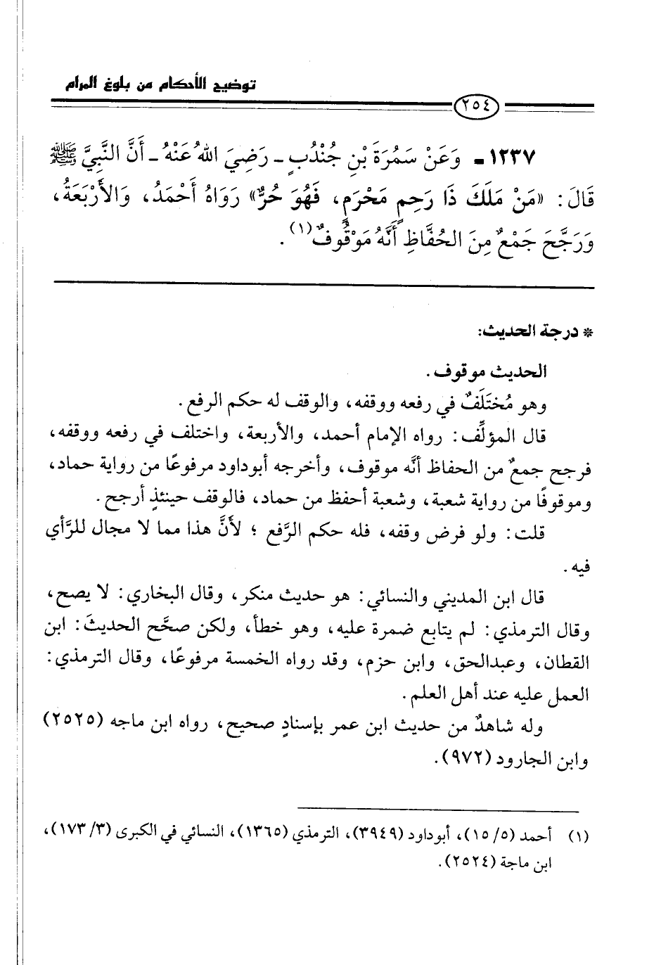 1237 - وَعَنْ سَمُرَةَ بْنِ جُنْدُبٍ -رَضِيَ اللهُ عَنْهُ- أَنَّ النَّبِيَّ -صلى الله عليه وسلم- قَالَ: "مَنْ مَلَكَ ذَا رَحِمٍ مَحْرَمٍ، فَهُوَ حُرٌّ" رَوَاهُ أَحْمَدُ، وَالأرْبَعَةُ، وَرَجَّحَ جَمْعٌ مِنَ الحُفَّاظِ أَنَّهُ مَوْقُوفٌ (¬1).