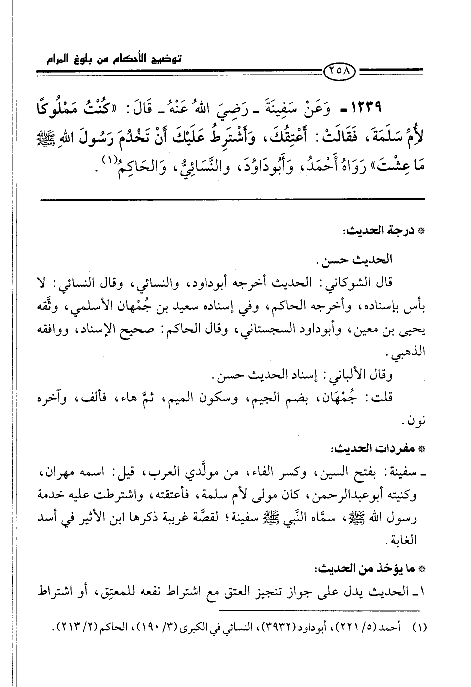 1239 - وَعَنْ سَفِينَةَ -رَضِيَ اللهُ عَنْهُ- قَالَ: "كُنْتُ مَمْلُوكًا لِأُمِّ سَلَمَةَ، فَقَالَتْ: أَعْتِقُكَ، وَأَشْتَرِطُ عَلَيْكَ أَنْ تَخدُمَ رَسُولَ اللهِ -صلى الله عليه وسلم- مَا عِشْتَ" رَوَاهُ أَحْمَدُ، وَأَبُو دَاوُدَ، والنَّسَائِيُّ، وَالحَاكِمُ (¬1).
