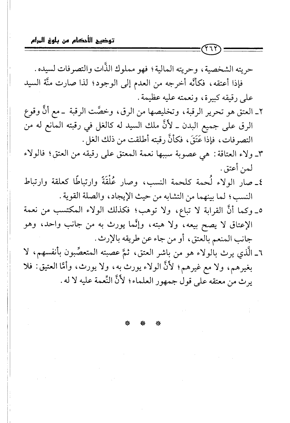 5 - وكما أنَّ القرابة لا تباع، ولا توهب؛ فكذلك الولاء المكتسب من نعمة الإعتاق لا يصح بيعه، ولا هبته، وإنَّما يورث به من جانب واحد، وهو جانب المنعم بالعتق، أو من جاء عن طريقه بالإرث.
