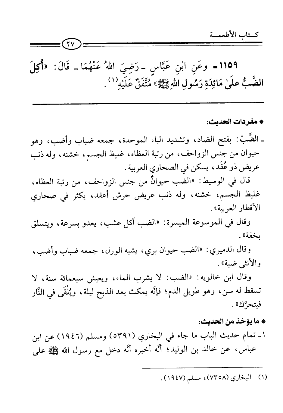 1159 - وعَنِ ابْنِ عَبَّاسٍ -رَضِيَ اللهُ عَنْهُمَا- قَالَ: "أُكِلَ الضَّبُّ علَى مَائِدَةِ رَسُولِ اللهِ -صلى الله عليه وسلم-" مُتَّفَقٌ عَلَيْهِ (¬1).