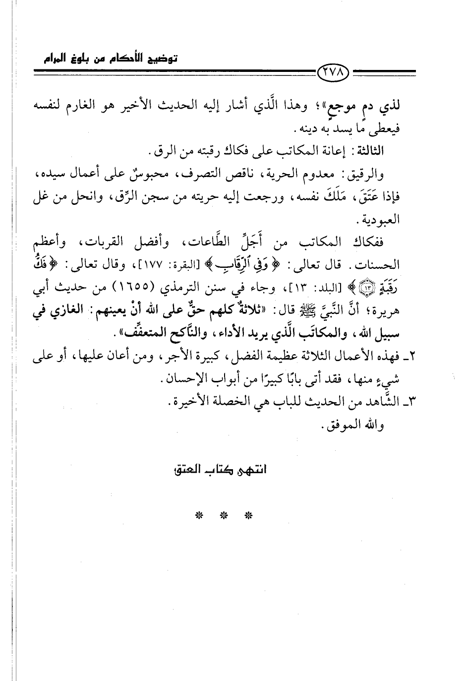 ففكاك المكاتب من أَجَلِّ الطَّاعات، وأفضل القربات، وأعظم الحسنات. قال تعالى: {وَفِي الرِّقَابِ} [البقرة: 177]، وقال تعالى: {فَكُّ رَقَبَةٍ (13)} [البلد: 13]، وجاء في سنن الترمذي (1655) من حديث أبي هريرة؛ أنَّ النَّبيَّ -صلى الله عليه وسلم- قال: "ثلاثةٌ كلهم حقٌّ على الله أنْ يعينهم: الغازي في سبيل الله، والمكاتَب الَّذي يريد الأداء، والنَّاكح المتعفِّف".