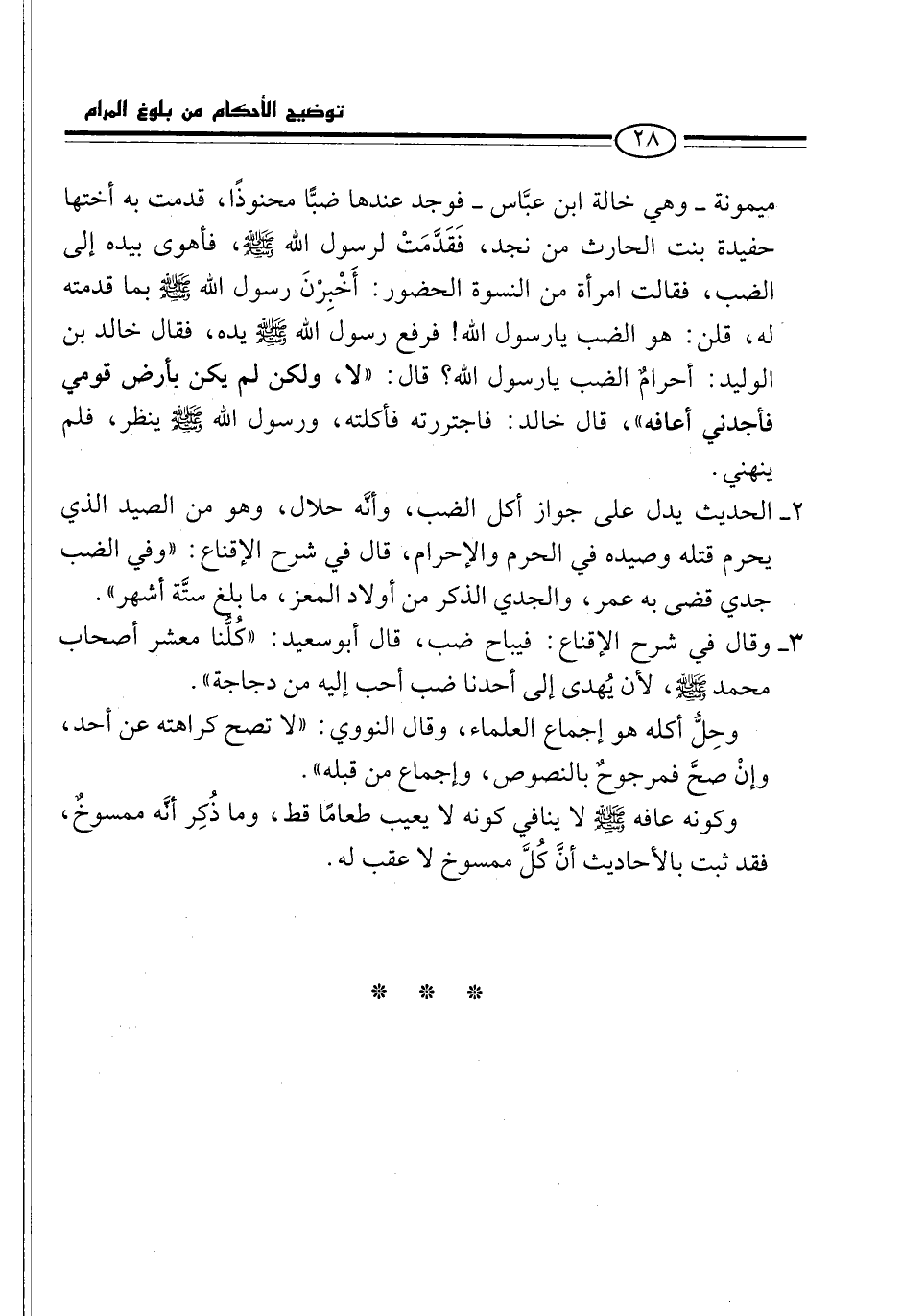 3 - وقال في شرح الإقناع: فيباح ضب، قال أبو سعيد: "كُلُّنا معشر أصحاب محمَّد -صلى الله عليه وسلم-؛ لأن يُهدى إلى أحدنا ضب أحب إليه من دجاجة".