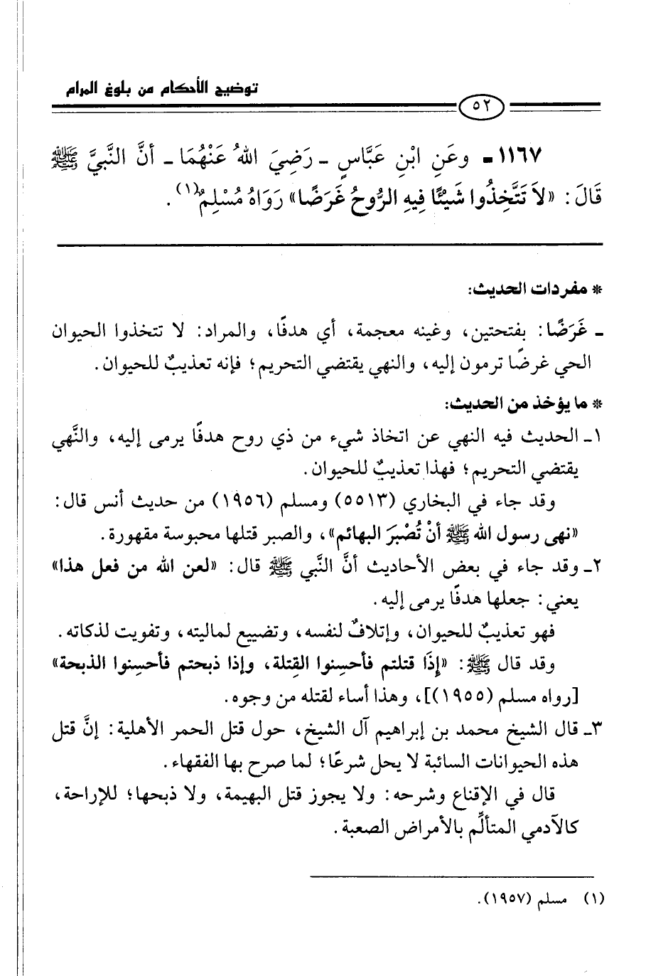 1167 - وعَنِ ابْنِ عَبَّاسٍ -رَضِيَ اللهُ عَنْهُمَا- أنَّ النَّبيَّ -صلى الله عليه وسلم- قَالَ: "لاَ تَتَّخِذُوا شَيْئًا فِيهِ الرُّوحُ غَرَضًا" رَوَاهُ مُسْلِمٌ (¬1).