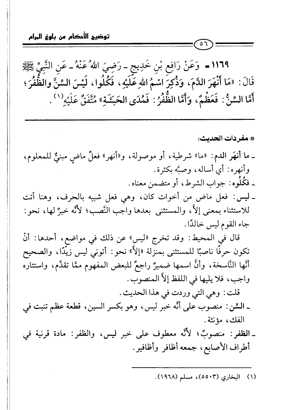 1169 - وَعَنْ رَافِع بْنِ خَدِيجٍ -رَضِيَ اللهُ عَنْهُ- عَنِ النَّبِيِّ -صلى الله عليه وسلم- قَالَ: "مَا أَنْهَرَ الدَّمَ، وَذُكِرَ اسْمُ اللهِ عَلَيْهِ، فَكُلُوا، لَيْسَ السِّنَّ والظُّفُرَ؛ أمَّا السِّنُّ: فَعَظْمٌ، وَأَمَّا الظُّفُرُ: فَمُدَى الحَبَشَةِ" مُتَّفَقٌ عَلَيْهِ (¬1).