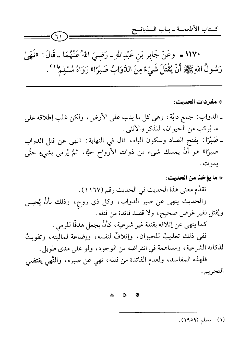 1170 - وعَنْ جَابِر بْنِ عَبْدِ اللهِ -رَضِيَ اللهُ عَنْهُمَا- قَالَ: "نَهَى رَسُولُ اللهِ -صلى الله عليه وسلم- أَنْ يُقْتَلَ شَيْءٌ مِنَ الدَّوَابِّ صَبْرًا" رَوَاهُ مُسْلِمٌ (¬1).