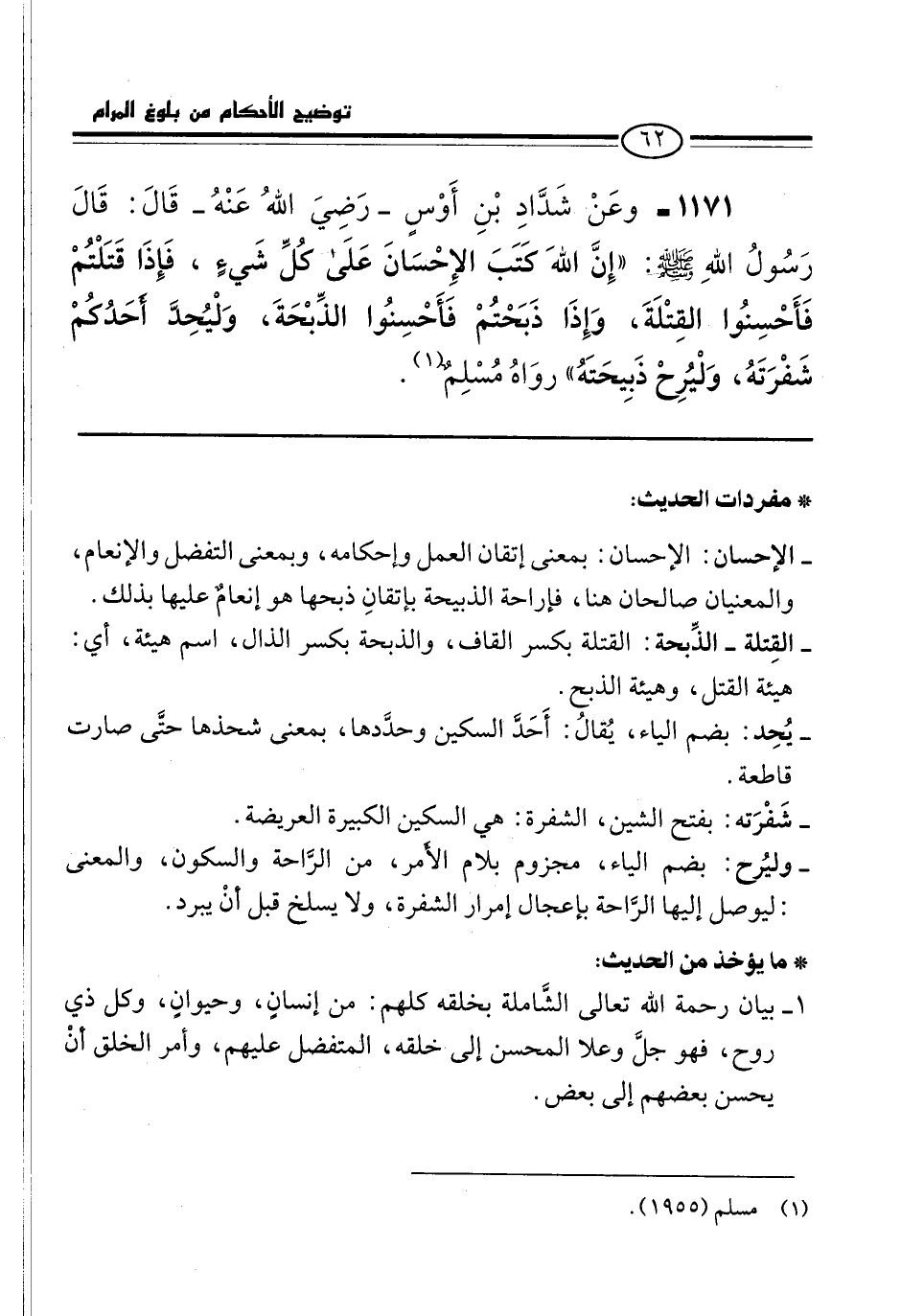1171 - وعَنْ شَدَّادِ بْنِ أَوْسٍ -رَضِيَ اللهُ عَنْهُ- قَالَ: قَالَ رَسُولُ اللهِ -صلى الله عليه وسلم-: "إِنَّ اللهَ كَتَبَ الإِحْسَانَ عَلَى كُلِّ شَيءٍ، فَإذَا قَتَلْتُمْ فَأَحْسِنُوا القِتْلَةَ، وَإِذَا ذَبَحْتُمْ فَأَحْسِنُوا الذِّبْحَةَ، وَلْيُحِدَّ أَحَدُكُمْ شَفْرَتَهُ، وَلْيُرِحْ ذَبِيحَتَهُ" روَاهُ مُسْلِمٌ (¬1).