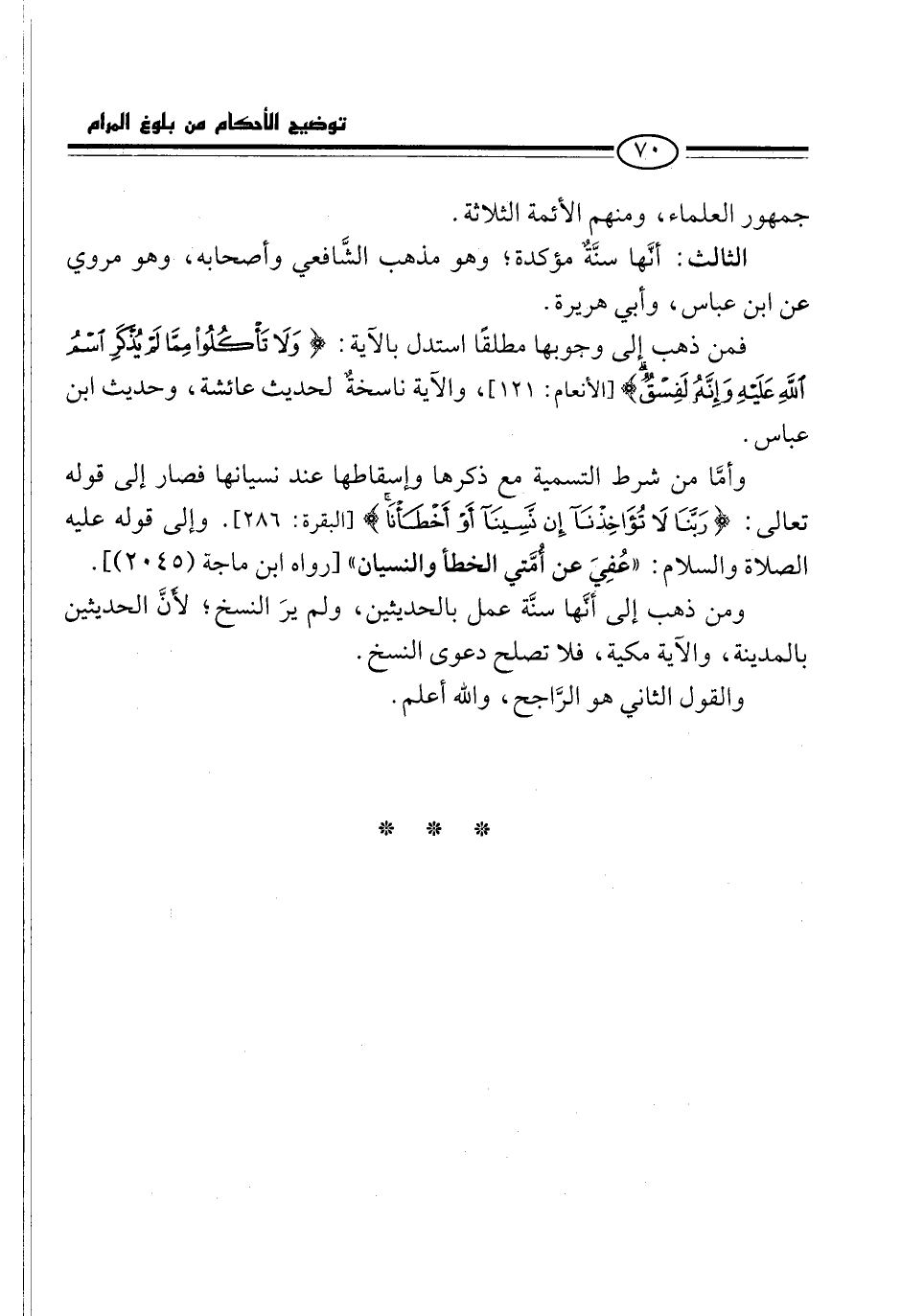 وأمَّا من شرط التسمية مع ذكرها وإسقاطها عند نسيانها فصار إلى قوله تعالى: {رَبَّنَا لَا تُؤَاخِذْنَا إِنْ نَسِينَا أَوْ أَخْطَأْنَا} [البقرة: 286]. وإلى قوله عليه الصلاة والسلام: "عُفِيَ عن أُمَّتي الخطأ والنسيان" [رواه ابن ماجة (2045)].