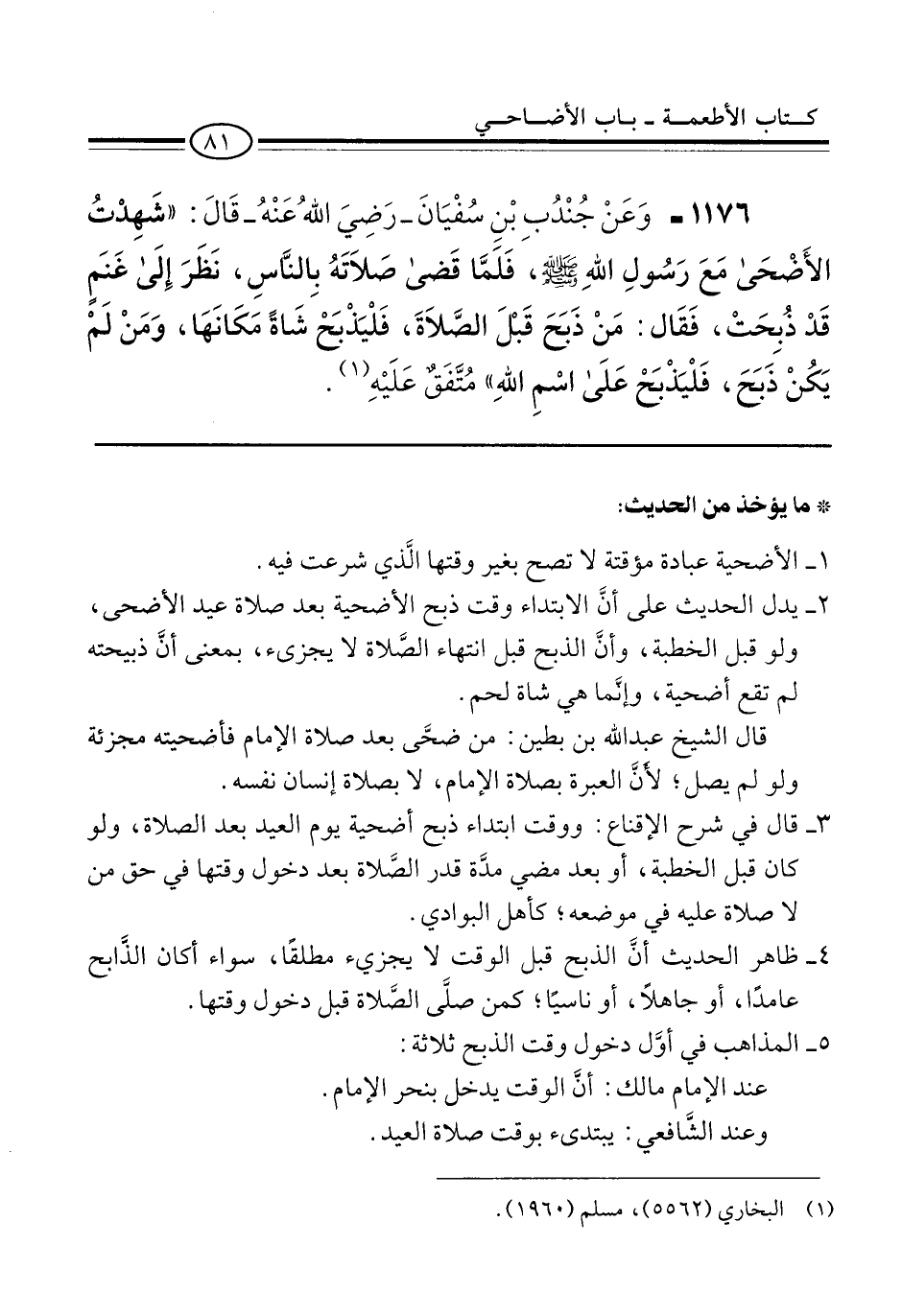 1176 - وَعَنْ جُنْدُبِ بْنِ سُفْيَانَ -رَضِيَ اللهُ عَنْهُ- قَالَ: "شَهِدْتُ الأَضْحَى مَعَ رَسُولِ اللهِ -صلى الله عليه وسلم-، فَلَمَّا قَضى صَلاَتَهُ بِالنَّاسِ، نَظَرَ إِلَى غَنَمٍ قَدْ ذُبِحَتْ، فَقَال: مَنْ ذَبَحَ قَبْلَ الصَّلاَةَ، فَلْيَذْبَحْ شَاةً مَكَانَهَا، وَمَنْ لَمْ يَكُنْ ذَبَحَ، فَلْيَذْبَحْ عَلَى اسْمِ اللهِ" مُتَّفَقٌ عَلَيْهِ (¬1).
