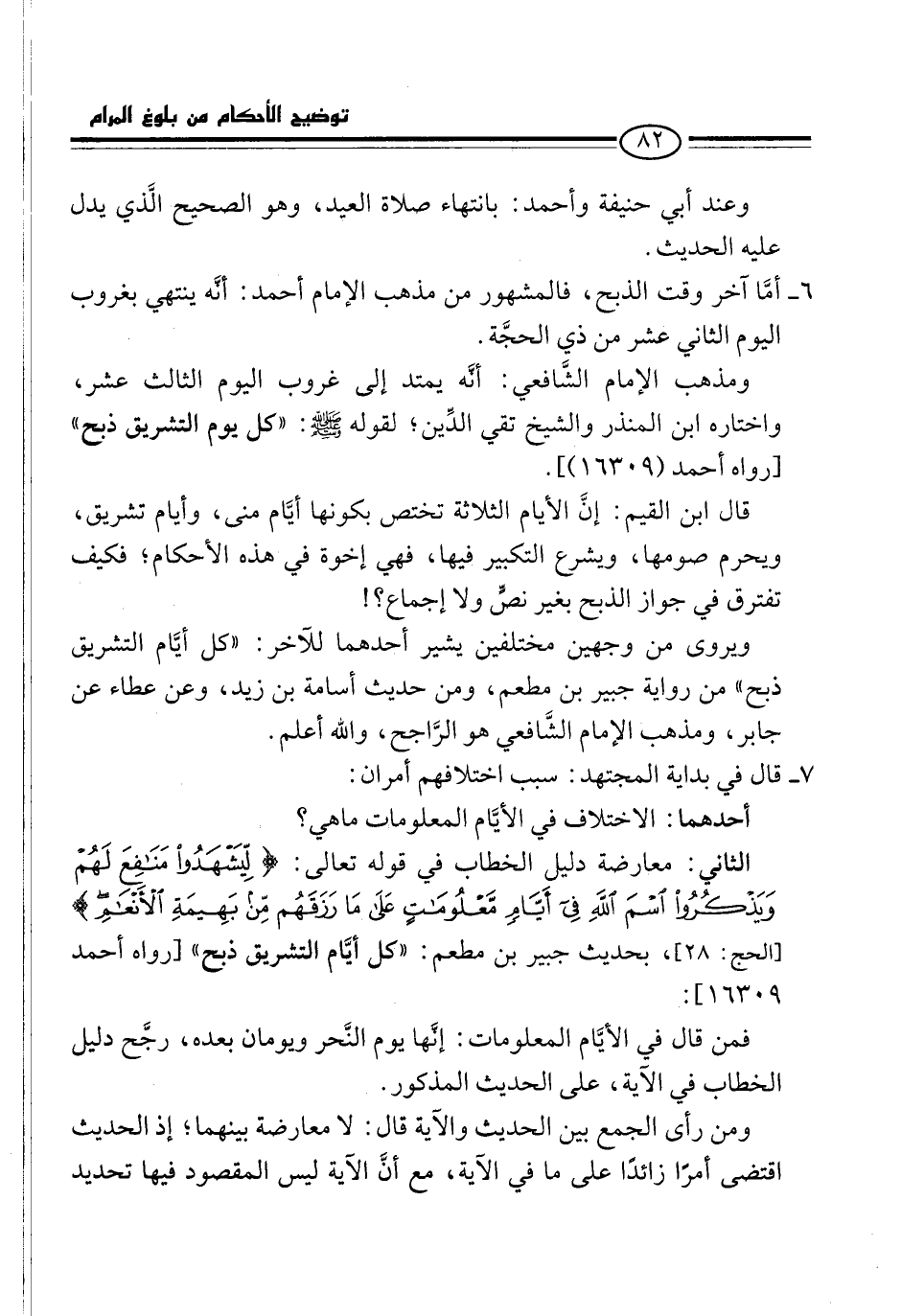 ومذهب الإِمام الشَّافعي: أنَّه يمتد إلى غروب اليوم الثالث عشر، واختاره ابن المنذر والشيخ تقي الدِّين؛ لقوله -صلى الله عليه وسلم-: "كل يوم التشريق ذبح" [رواه أحمد (16309)].