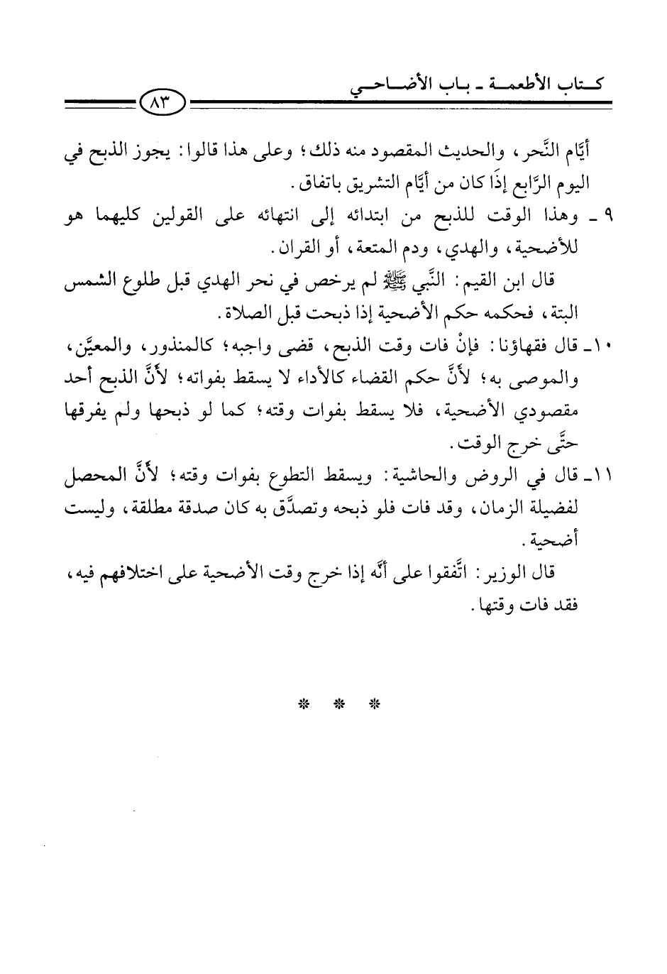 11 - قال في الروض والحاشية: ويسقط التطوع بفوات وقته؛ لأنَّ المحصل لفضيلة الزمان، وقد فات فلو ذبحه وتصدَّق به كان صدقة مطلقة، وليست أضحية.