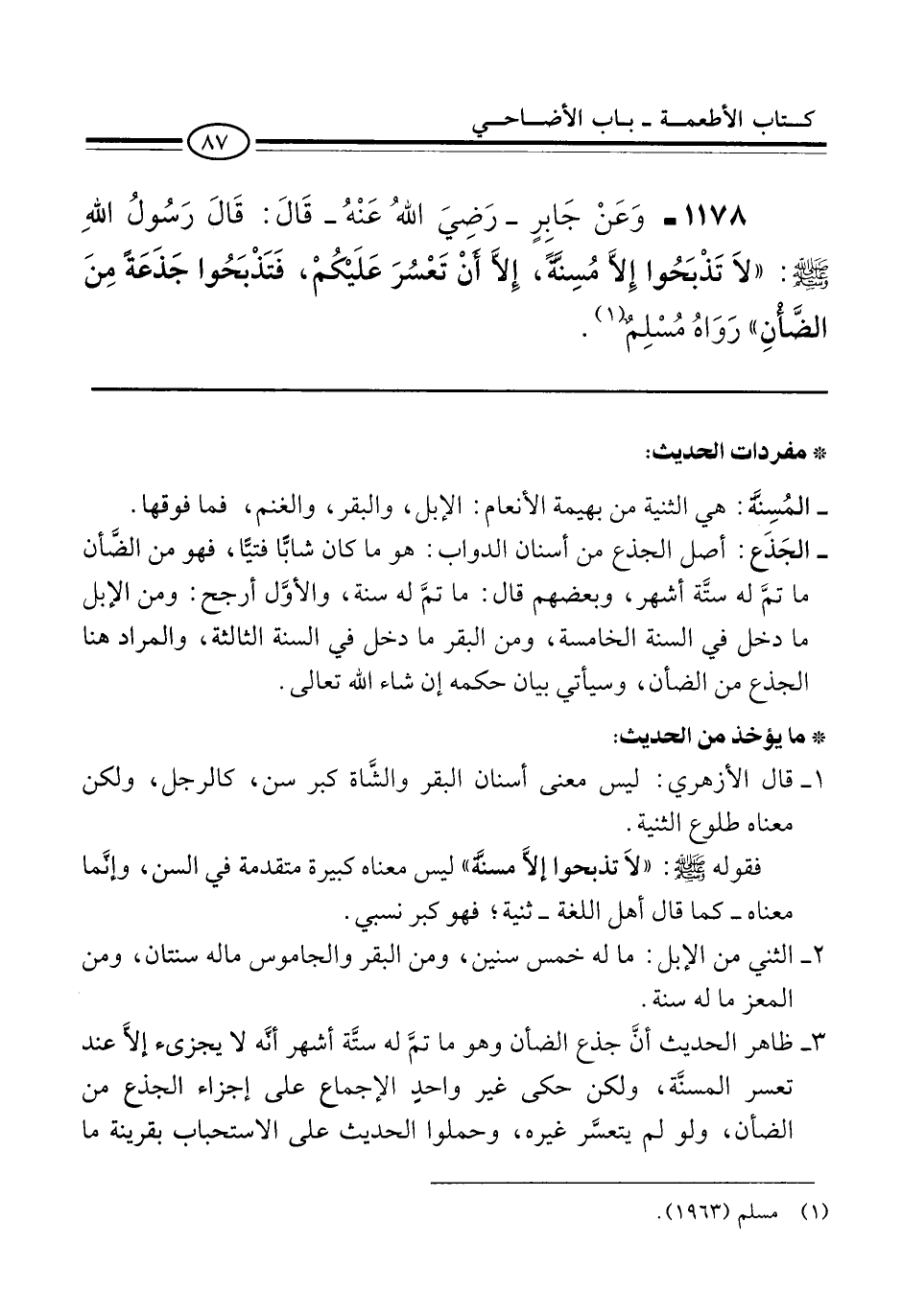 1178 - وَعَنْ جَابِرٍ -رَضِيَ اللهُ عَنْهُ- قَالَ: قَالَ رَسُولُ اللهِ -صلى الله عليه وسلم-: "لاَ تَذْبَحُوا إِلاَّ مُسِنَّةً، إِلاَّ أَنْ تَعْسُرَ عَلَيْكُمْ، فَتَذْبَحُوا جَذَعَةً مِنَ الضَّأْنِ" رَوَاهُ مُسْلِمٌ (¬1).