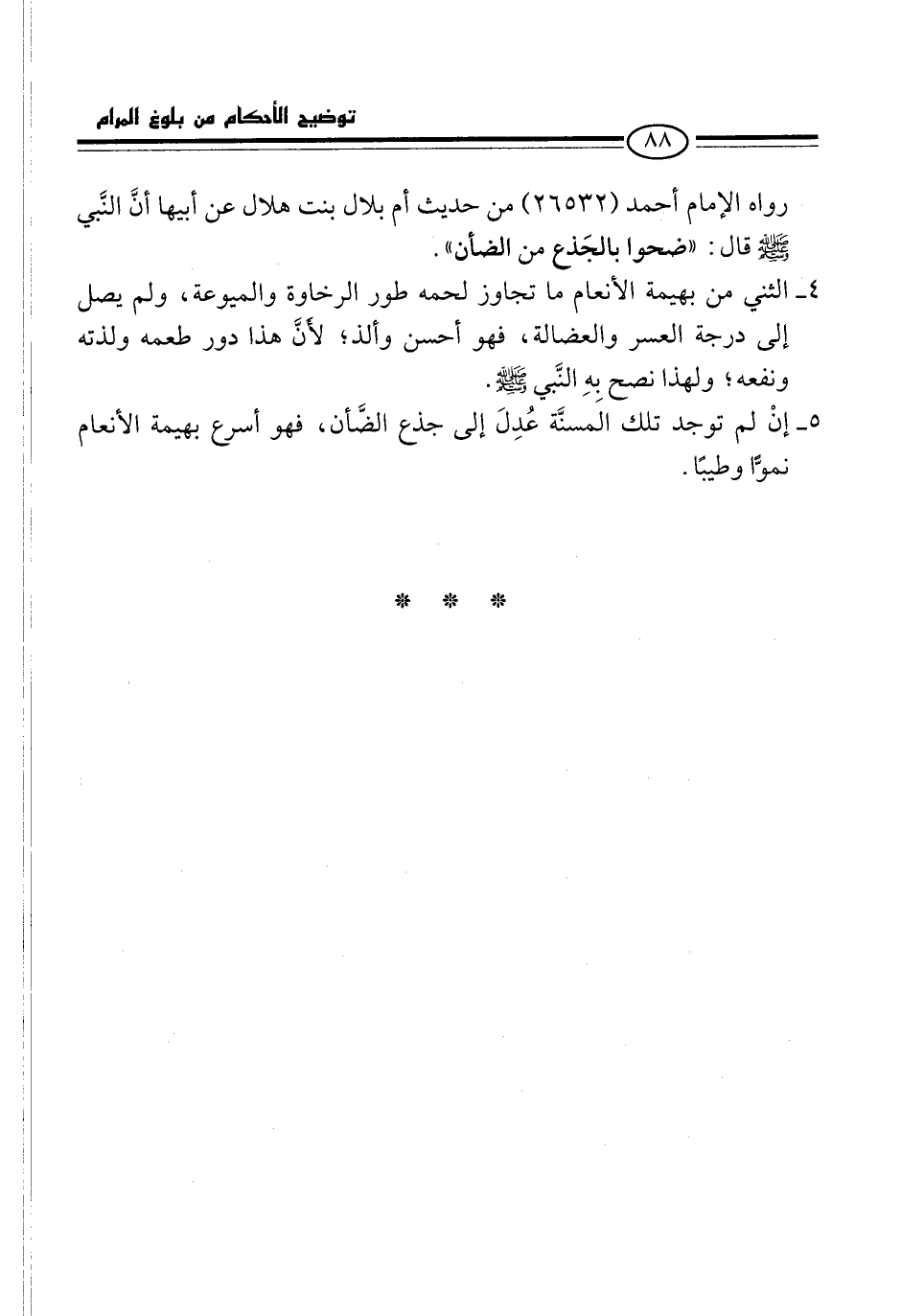 4 - الثني من بهيمة الأنعام ما تجاوز لحمه طور الرخاوة والميوعة، ولم يصل إلى درجة العسر والعضالة، فهو أحسن وألذ؛ لأنَّ هذا دور طعمه ولذته ونفعه؛ ولهذا نصح بِهِ النَّبي -صلى الله عليه وسلم-.