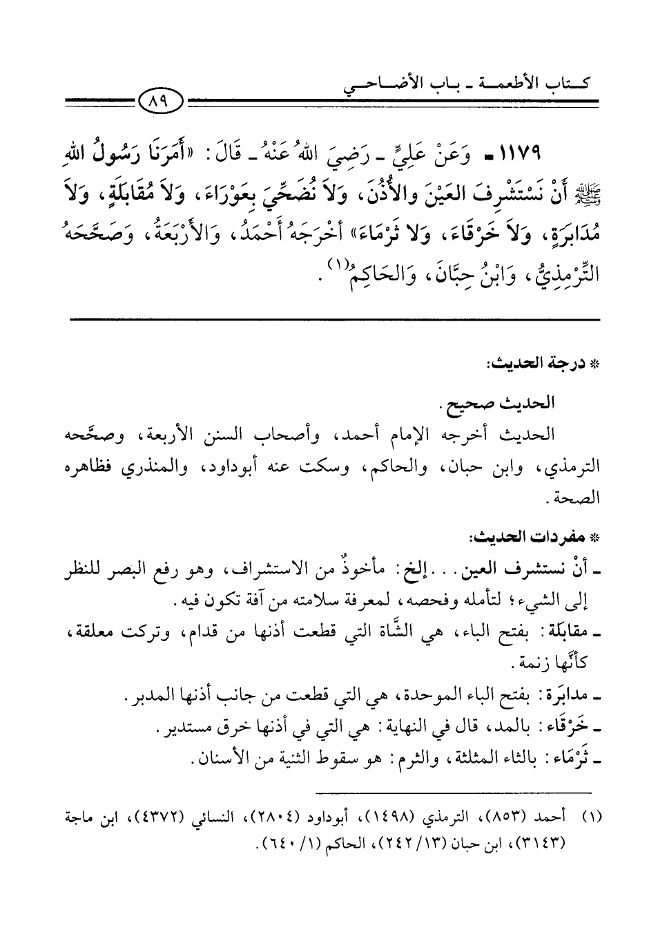 1179 - وَعَنْ عَلِيٍّ -رَضِيَ اللهُ عَنْهُ- قَالَ: "أَمَرَنَا رَسُولُ اللهِ -صلى الله عليه وسلم- أَنْ نَسْتَشْرِفَ العَيْنَ والأُذُنَ، وَلاَ نُضَحِّيَ بِعَوْرَاءَ، وَلاَ مُقَابلَةٍ، وَلاَ مُدَابَرَةٍ، وَلاَ خَرْقَاءَ، وَلا ثرْمَاءَ" أخْرَجَهُ أَحْمَدُ، وَالأرْبَعَةُ، وَصَحَّحَهُ التِّرْمِذِيُّ، وَابْنُ حِبَّانَ، وَالحَاكِمُ (¬1).
