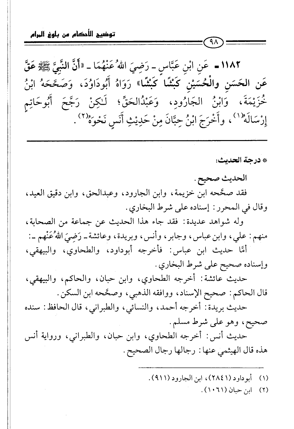 1182 - عَنِ ابْنِ عَبَّاسٍ -رَضِيَ اللهُ عَنْهُمَا- "أنَّ النَّبِيَّ -صلى الله عليه وسلم- عَقَّ عَن الحَسَنِ والْحُسَيْنِ كبْشًا كبْشًا" رَوَاهُ أَبُو دَاوُدَ، وَصَحَّحَهُ ابْنُ خُزَيْمَةَ، وَابْنُ الجَارُودِ، وَعَبْدُ الحَقِّ، لَكِنْ رَجَّحَ أَبُو حَاتِمٍ إِرْسَالَهُ (¬1)، وأَخْرَجَ ابْنُ حِبَّانَ مِنْ حَدِيْثِ أَنَسٍ نَحْوَهُ (¬2).