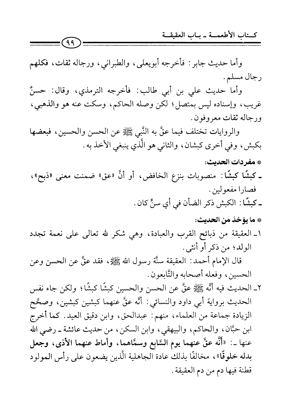 2 - الحديث فيه أنَّه -صلى الله عليه وسلم- عقَّ عن الحسن والحسين كبشًا كبشًا؛ ولكن جاء نفس الحديث برواية أبي داود والنسائي: أنَّه عقَّ عنهما كبشين كبشين، وصحَّح الزيادة جماعة من العلماء، منهم: عبد الحق، وابن دقيق العيد. كما أخرج ابن حبَّان، والحاكم، والبيهقي، وابن السكن، من حديث عائشة -رضي الله عنها-: "أنَّه عقَّ عنهما يوم السَّابع وسمَّاهما، وأماط عنهما الأذى، وجعل بدله خلوقًا"، مخالفًا بذلك عادة الجاهلية الَّذين يضعون على رأس المولود قطنة فيها دم من دم العقيقة.