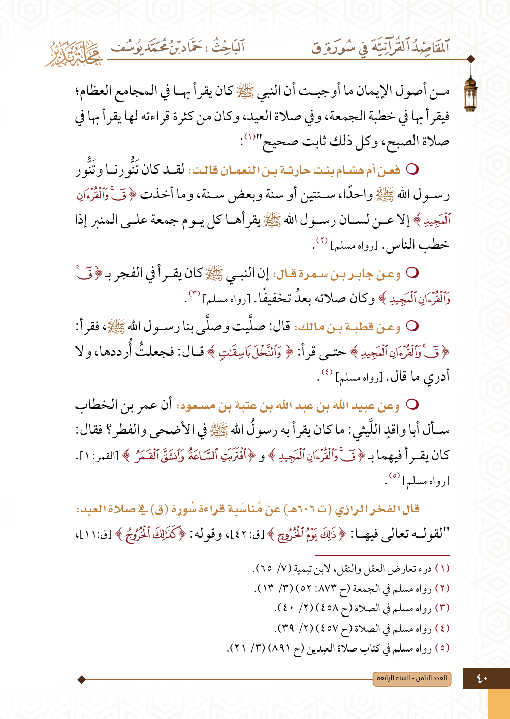 قال الفخر الرازي (ت ٦٠٦ هـ) عن مُناسَبة قراءة سُورة (ق) في صلاة العيد: "لقوله تعالى فيها: {ذَلِكَ يَوْمُ الْخُرُوجِ} [ق: ٤٢]، وقوله: {كَذَلِكَ الْخُرُوجُ} [ق:١١]،