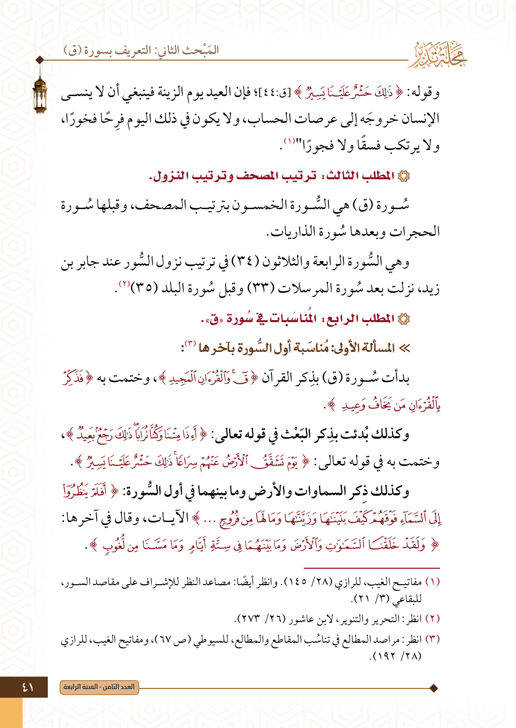 المطلب الرابع: المُناسَبات في سُورة «ق».