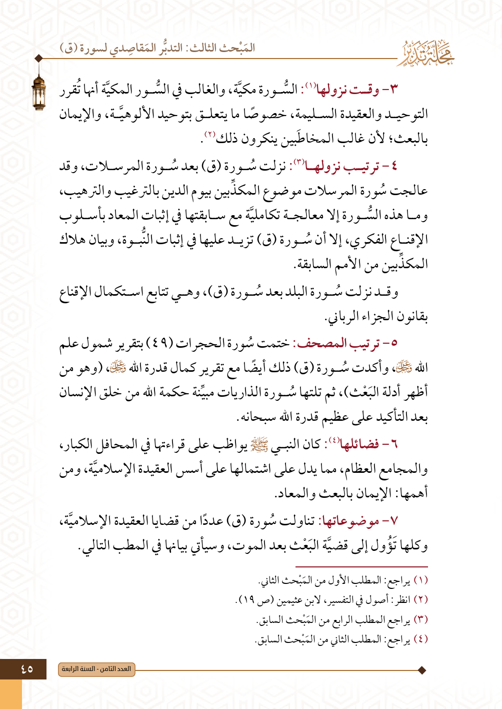 ٧ - موضوعاتها: تناولت سُورة (ق) عددًا من قضايا العقيدة الإسلاميَّة، وكلها تَؤُول إلى قضيَّة البَعْث بعد الموت، وسيأتي بيانها في المطب التالي.