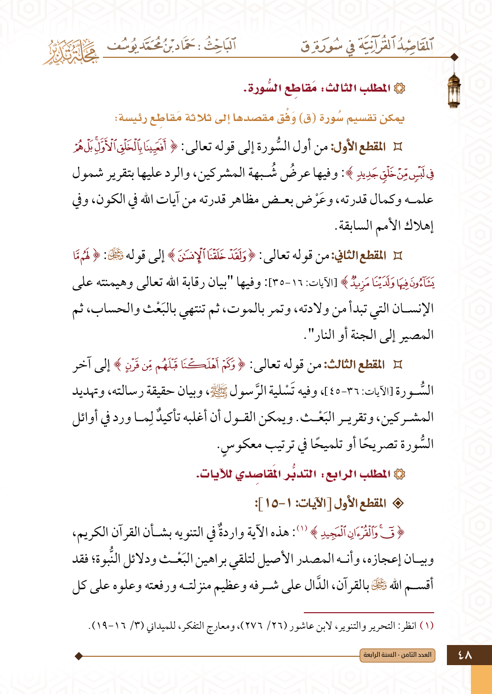 يمكن تقسيم سُورة (ق) وَفْق مقصدها إلى ثلاثة مَقاطِع رئيسة:
