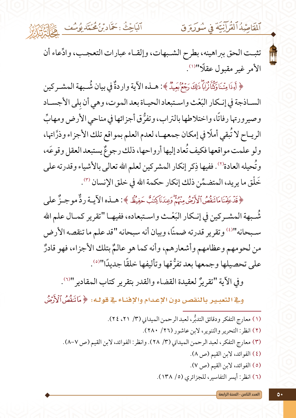 {قَدْ عَلِمْنَا مَا تَنْقُصُ الْأَرْضُ مِنْهُمْ وَعِنْدَنَا كِتَابٌ حَفِيظٌ}: هذه الآية ردٌّ موجزٌ على شُبهة المشركين في إنكار البَعْث واستبعاده، ففيها "تقرير كمال علم الله سبحانه" (¬٤)