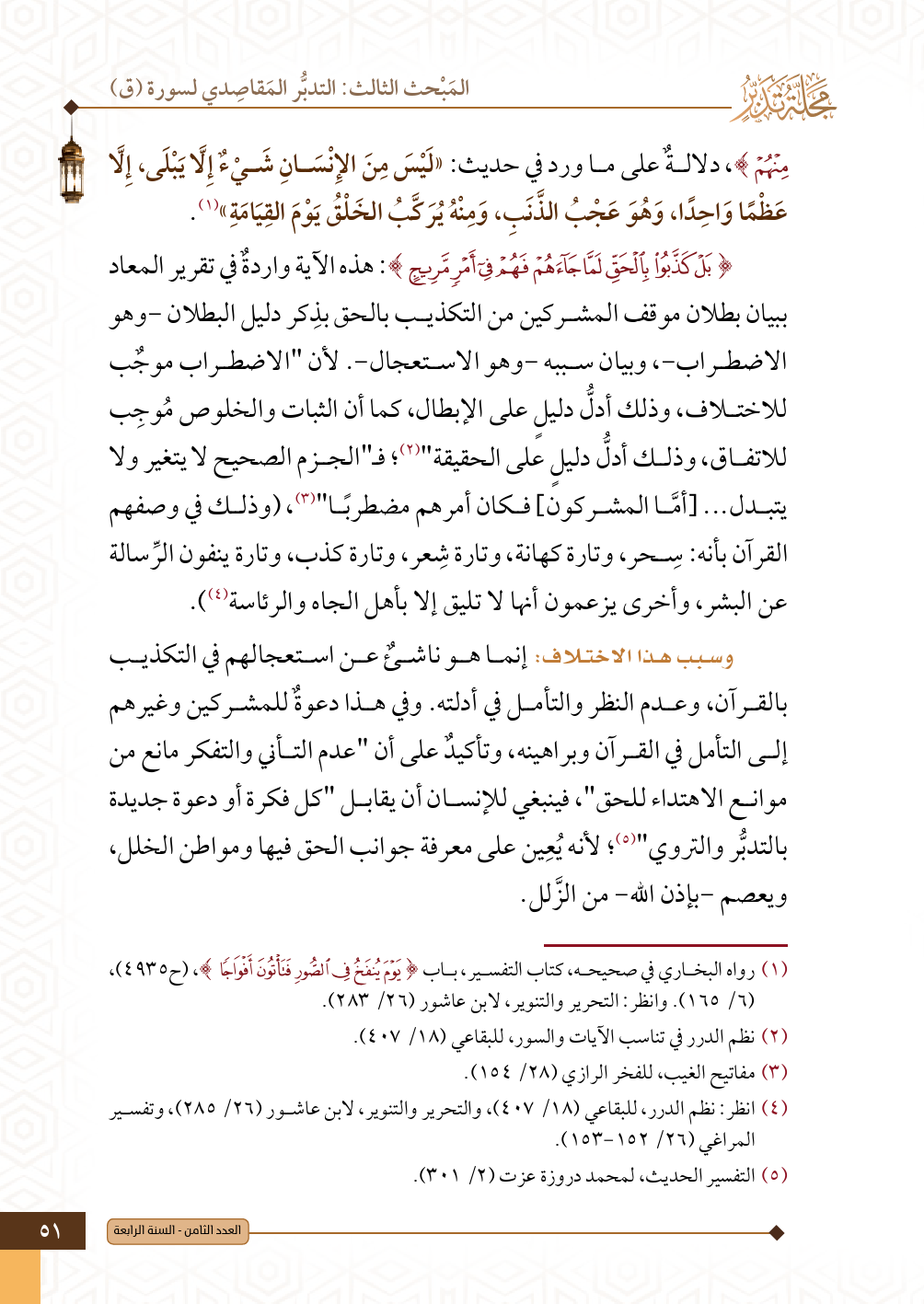 {بَلْ كَذَّبُوا بِالْحَقِّ لَمَّا جَاءَهُمْ فَهُمْ فِي أَمْرٍ مَرِيجٍ}: هذه الآية واردةٌ في تقرير المعاد ببيان بطلان موقف المشركين من التكذيب بالحق بذِكر دليل البطلان -وهو الاضطراب-، وبيان سببه -وهو الاستعجال-. لأن "الاضطراب موجبٌ للاختلاف، وذلك أدلُّ دليلٍ على الإبطال، كما أن الثبات والخلوص مُوجِب للاتفاق، وذلك أدلُّ دليلٍ على الحقيقة" (¬٢)؛ فـ"الجزم الصحيح لا يتغير ولا يتبدل ... [أمَّا المشركون] فكان أمرهم مضطربًا" (¬٣)، (وذلك في وصفهم القرآن بأنه: سِحر، وتارة كهانة، وتارة شِعر، وتارة كذب، وتارة ينفون الرِّسالة عن البشر، وأخرى يزعمون أنها لا تليق إلا بأهل الجاه والرئاسة (¬٤).